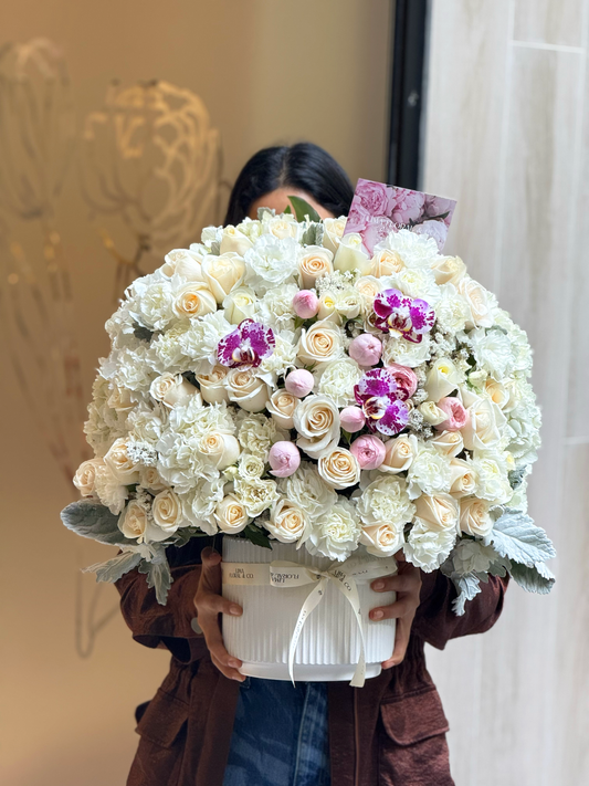 Box Juicy XL: Arreglo Premium de Hortensias, Peonias y Rosas importadas