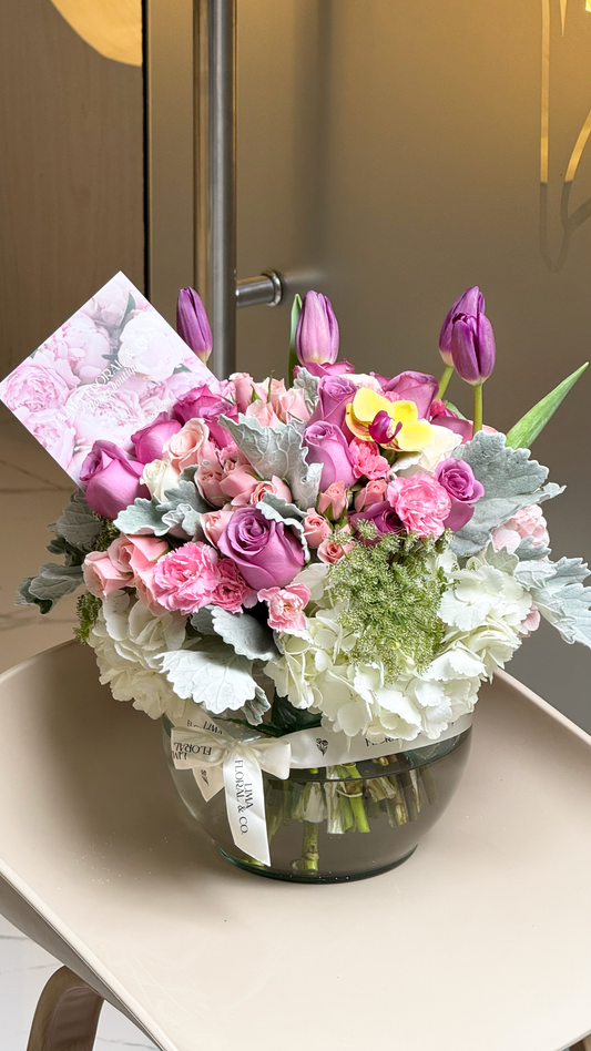 Box Floral: Tulipanes, Rosas Inglesas Peonias, Mini Rosas y Hortensias