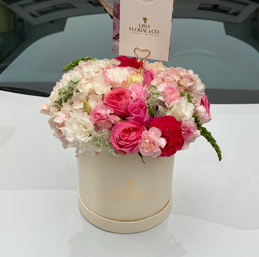 Box Pink Dreams: Rosas Importadas, Hortensias, Lisianthus, Mix de flores premium