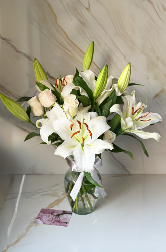 Descuento especialJarrón Garden: Lirios, Lisianthus, Claveles y Rosas
