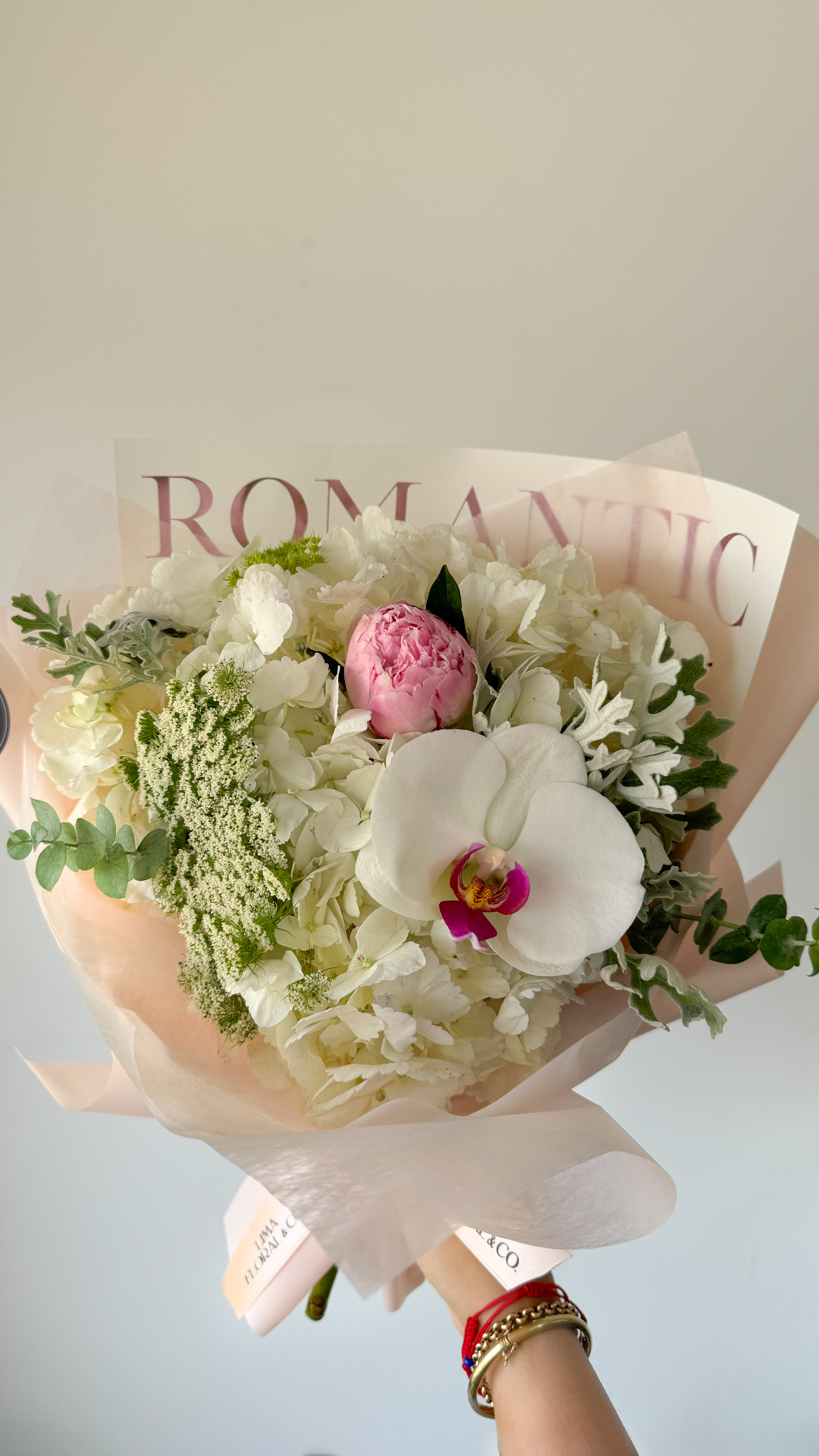 Una peonía natural acompañada de un mix de verdes y una orquídea, aportando un toque especial y delicado.