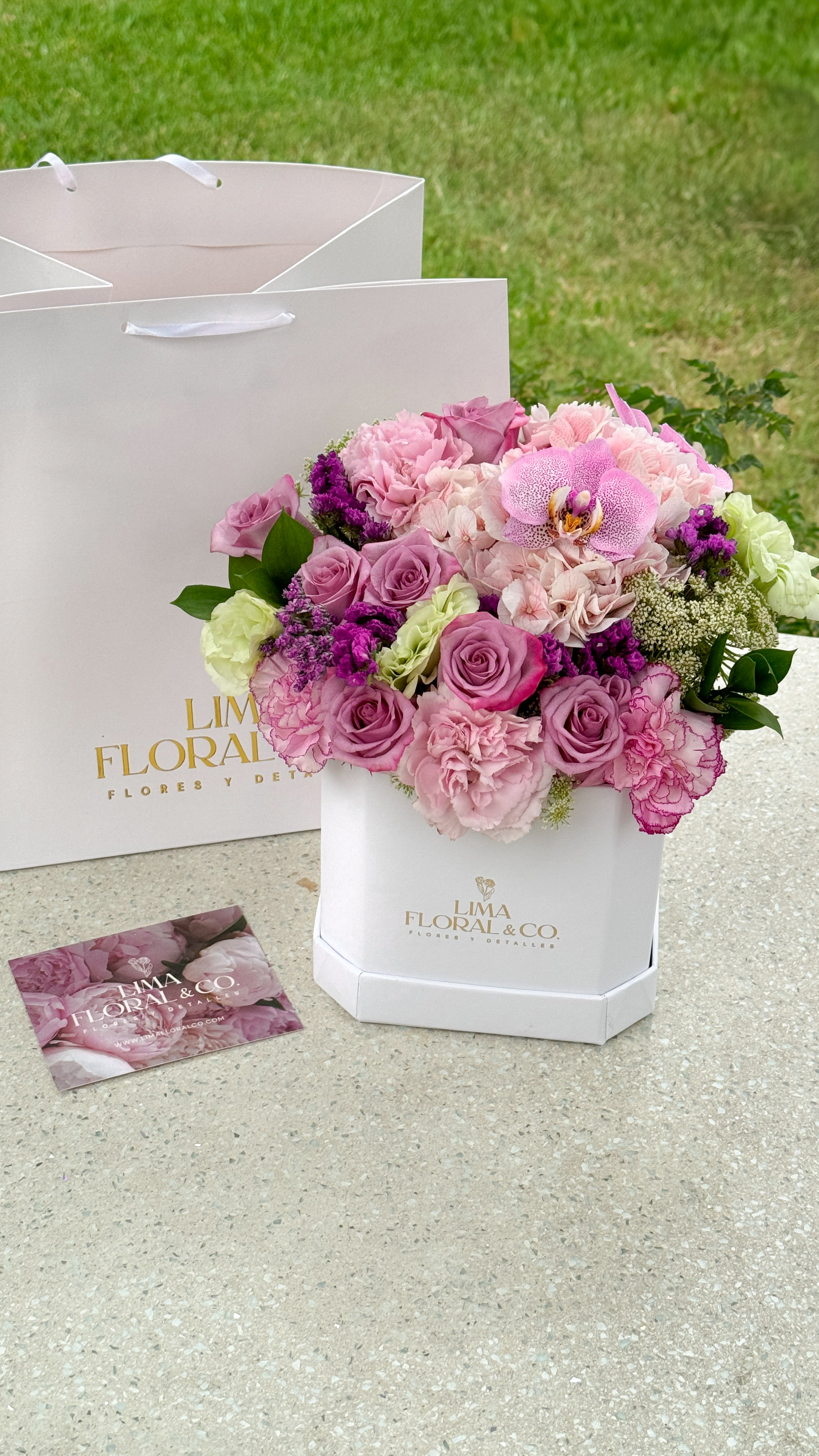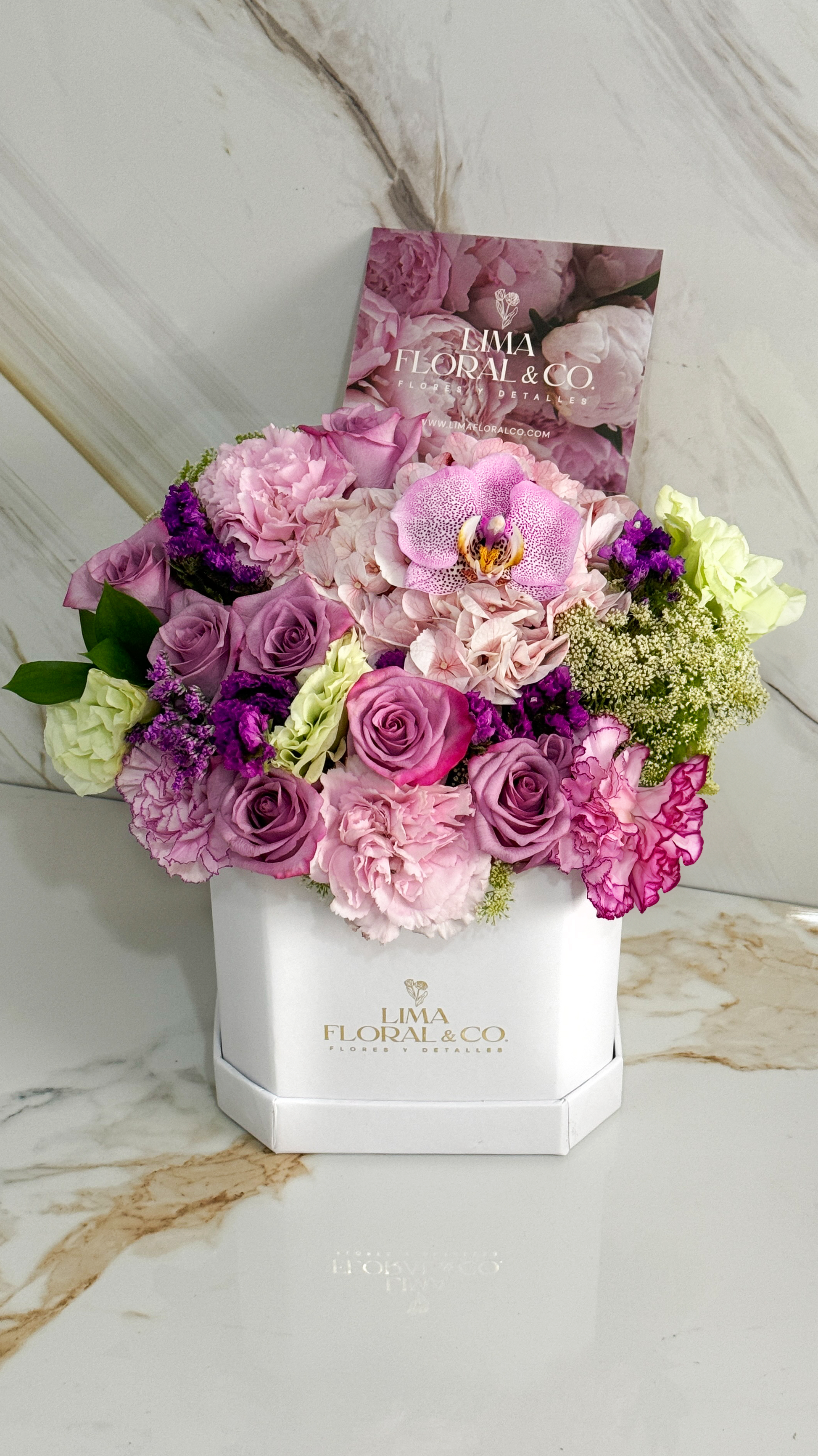 Una caja floral que enamora con su mezcla de tonos lila y una selección única de 12 rosas, claveles, lisianthus y una orquídea como toque especial. Incluye globo y tarjeta de dedicatoria para hacer el detalle aún más personal y especial. Perfecto para quienes buscan regalar elegancia en una presentación premium.