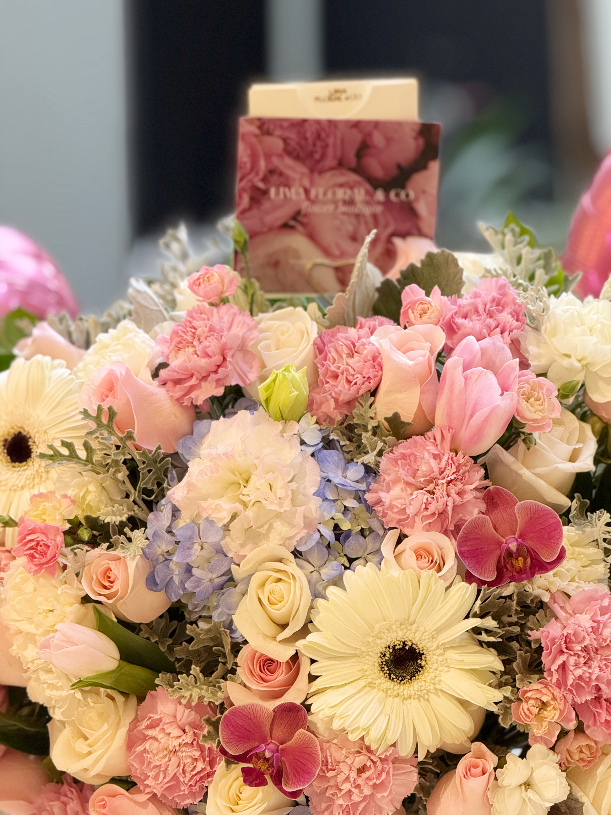 Un diseño elegante y lleno de encanto. Este box extra grande combina rosas rosadas, tulipanes y orquídeas en una armonía perfecta con gerberas blancas, hortensia celeste y claveles importados en tonos blancos y rosados. Un regalo inolvidable para celebrar momentos importantes con estilo y dulzura.