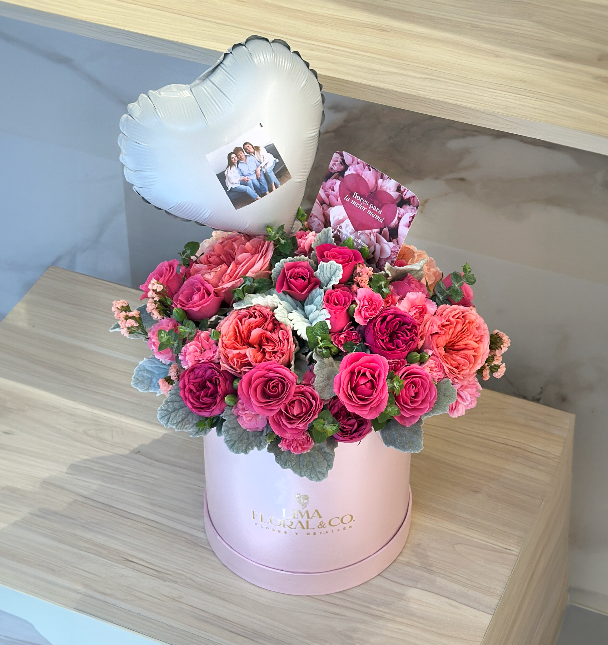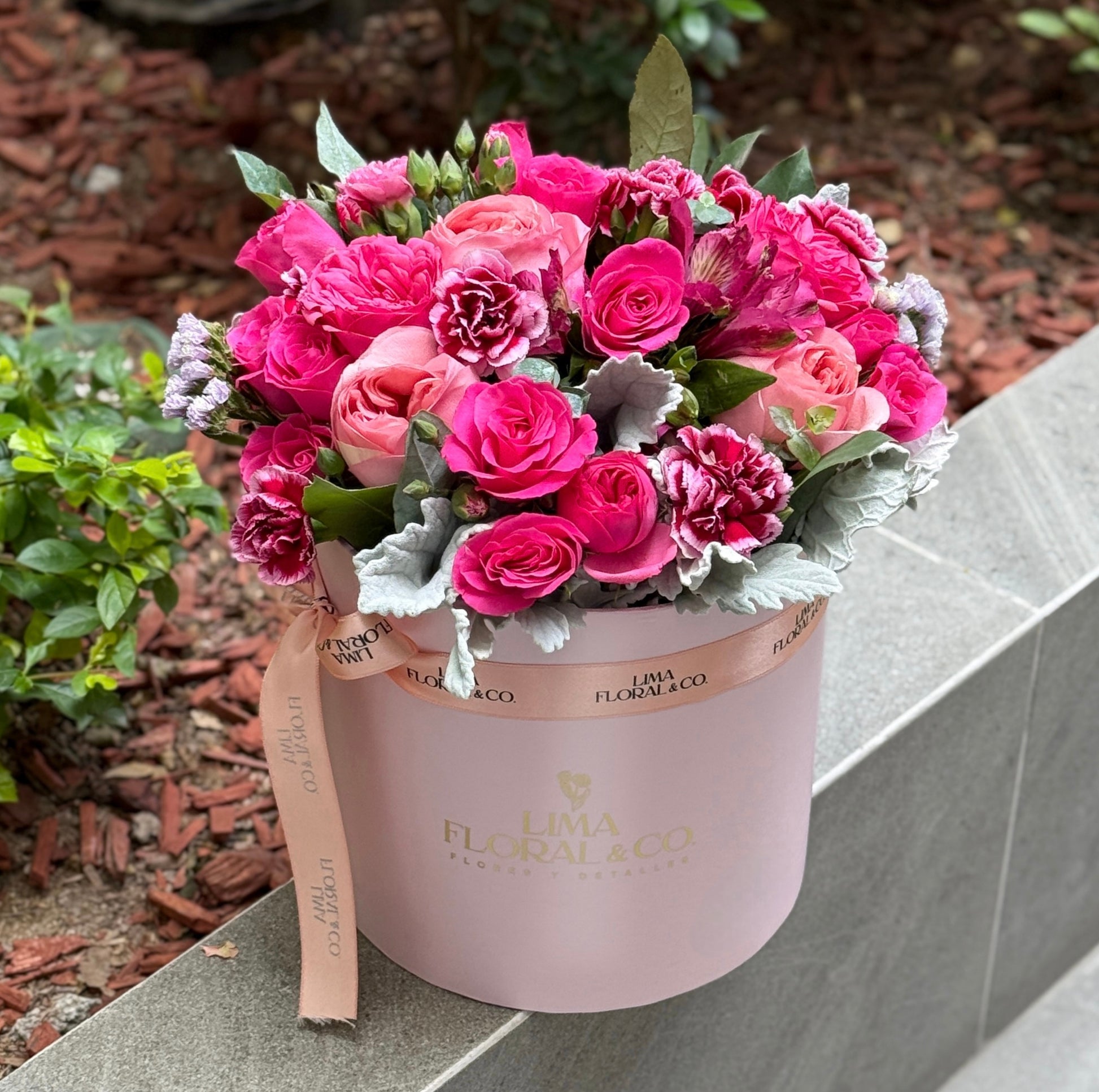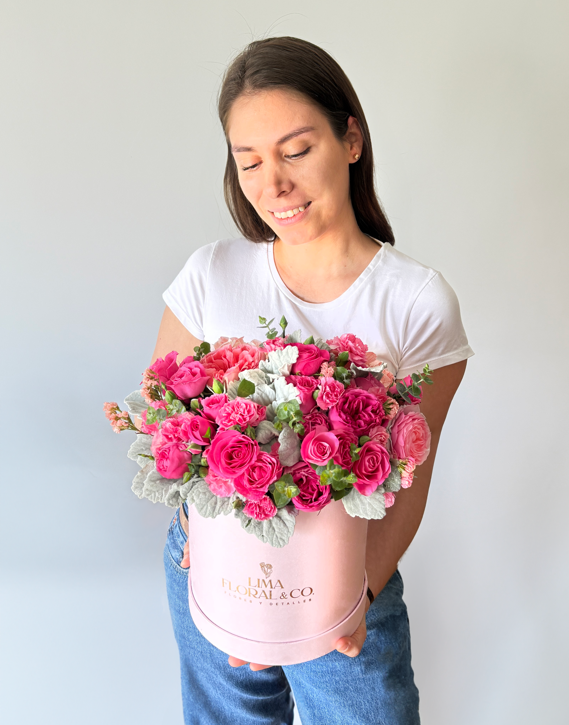 Para las que aman el rosado: mini rosas, rosas inglesas y rosas garden pink expression en una combinación armoniosa. Un diseño soñado para las amantes del rosado.