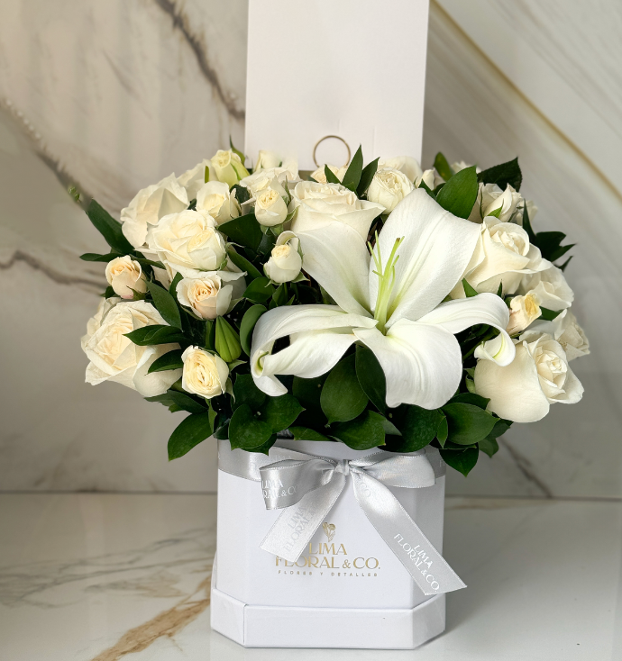 Hermosa combinación de mini rosas blancas y lirios, una opción delicada y especial para expresar apoyo y acompañar en momentos difíciles.