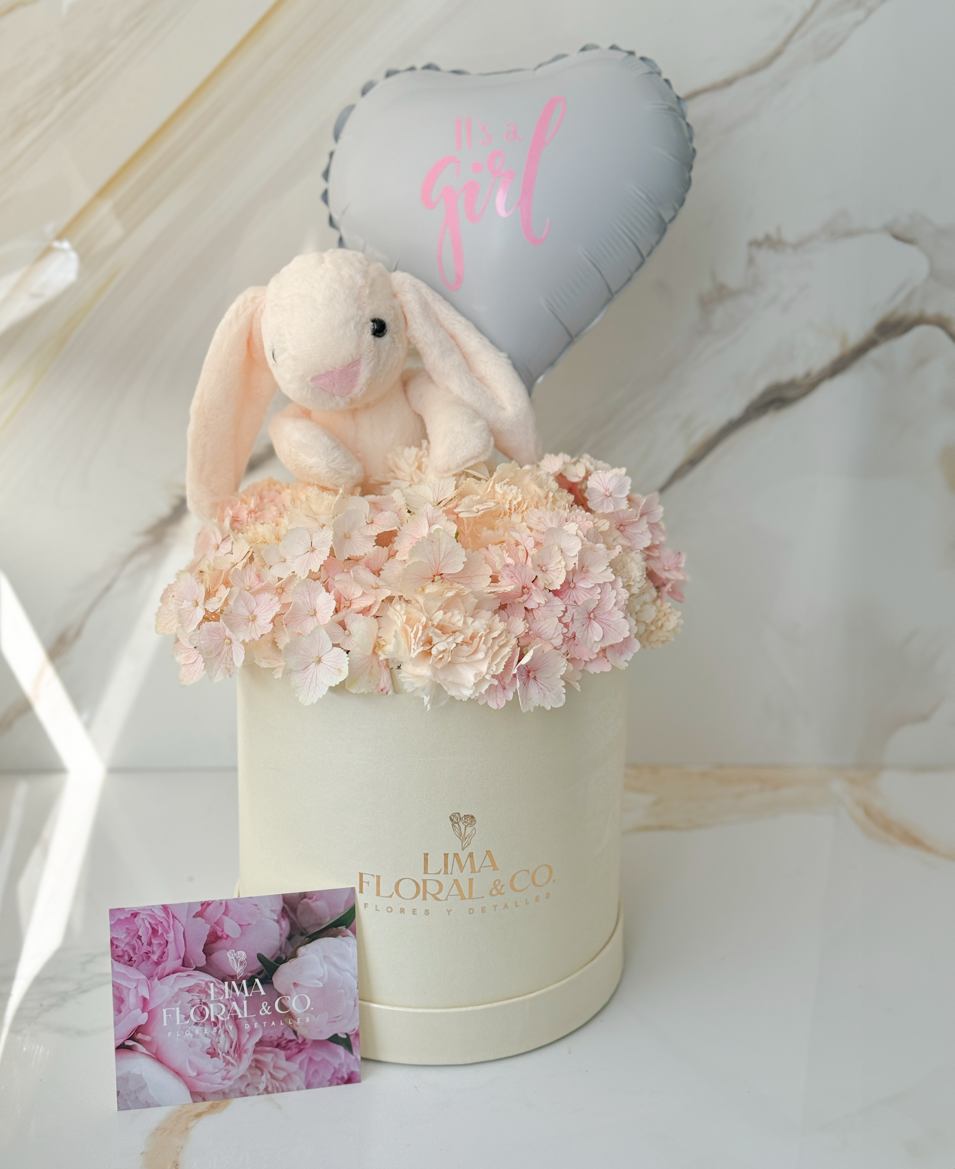 Celebra la llegada de una hermosa bebé con nuestro Box Baby in Bloom. Este encantador arreglo combina delicadas hortensias y claveles importados en suaves tonos rosado y crema, perfectos para dar la bienvenida al nuevo miembro de la familia. Incluye un adorable conejito de peluche y un globo personalizado para hacer el momento aún más especial. Ideal para nacimientos y baby showers, este box es un gesto de amor y ternura que todos adorarán.