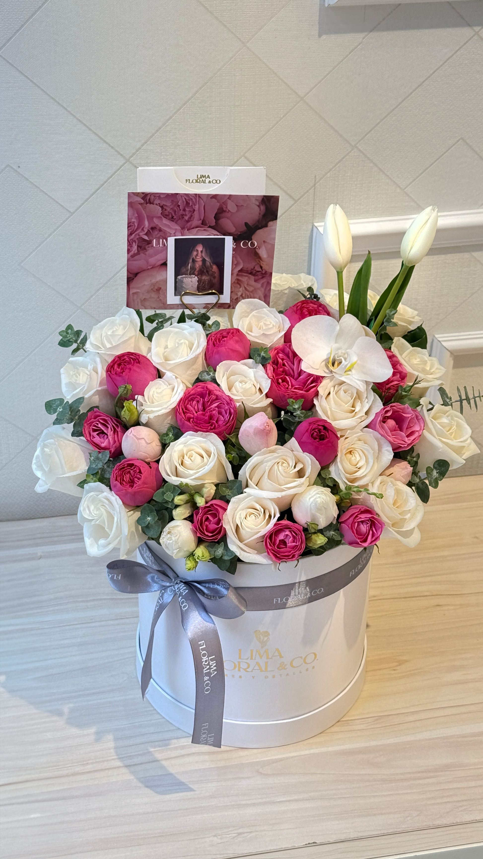 Un box delicado, femenino y lleno de encanto. Incluye rosas inglesas, mini rosas, tulipanes y una orquídea natural cuidadosamente combinados en un arreglo compacto y elegante.