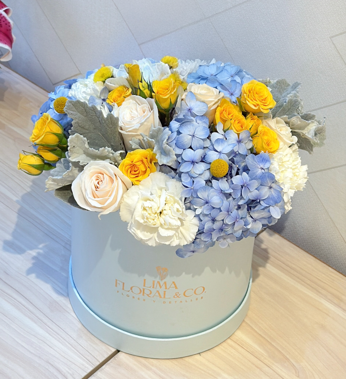 Una combinación luminosa y elegante: hortensias celestes como el cielo, mini rosas amarillas como rayos de sol, y toques blancos de rosas y claveles que le dan pureza y frescura al arreglo.