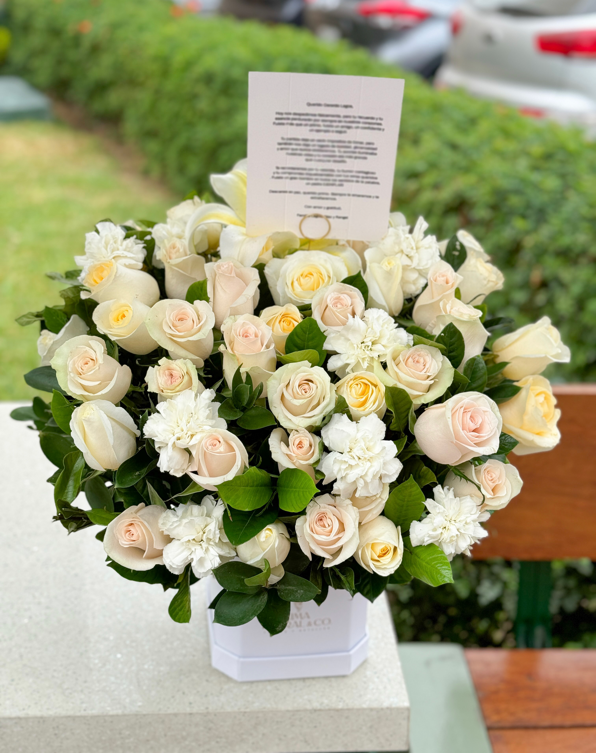 Este elegante arreglo en forma redonda combina 50 flores blancas, incluyendo claveles, lirio y rosas. Un detalle sobrio y delicado que transmite paz y serenidad.