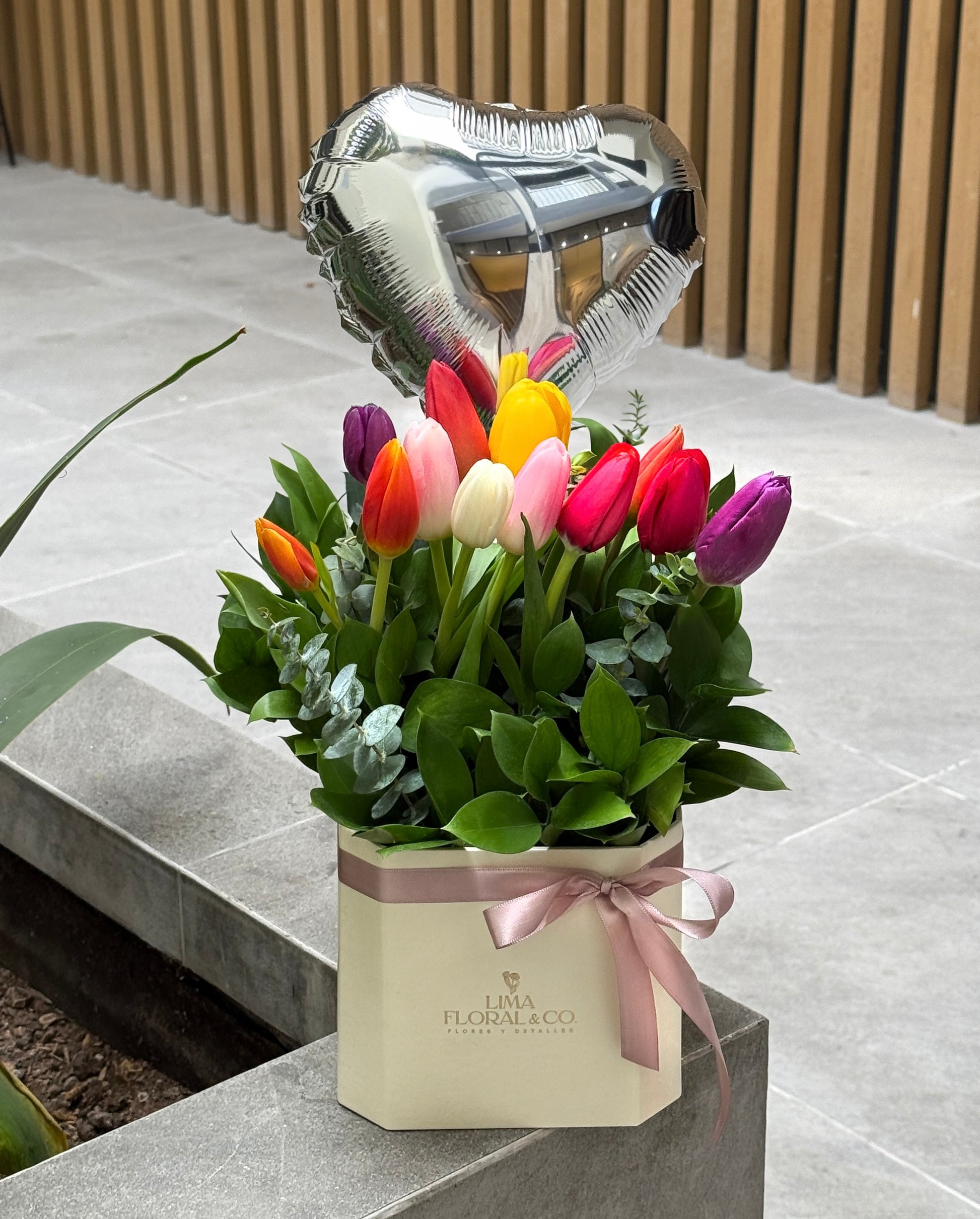 Mini box con 10 tulipanes multicolor y fino follaje. Incluye globo de corazón de cortesía, tarjeta de dedicatoria y bolsa. Personaliza el globo para un toque único.