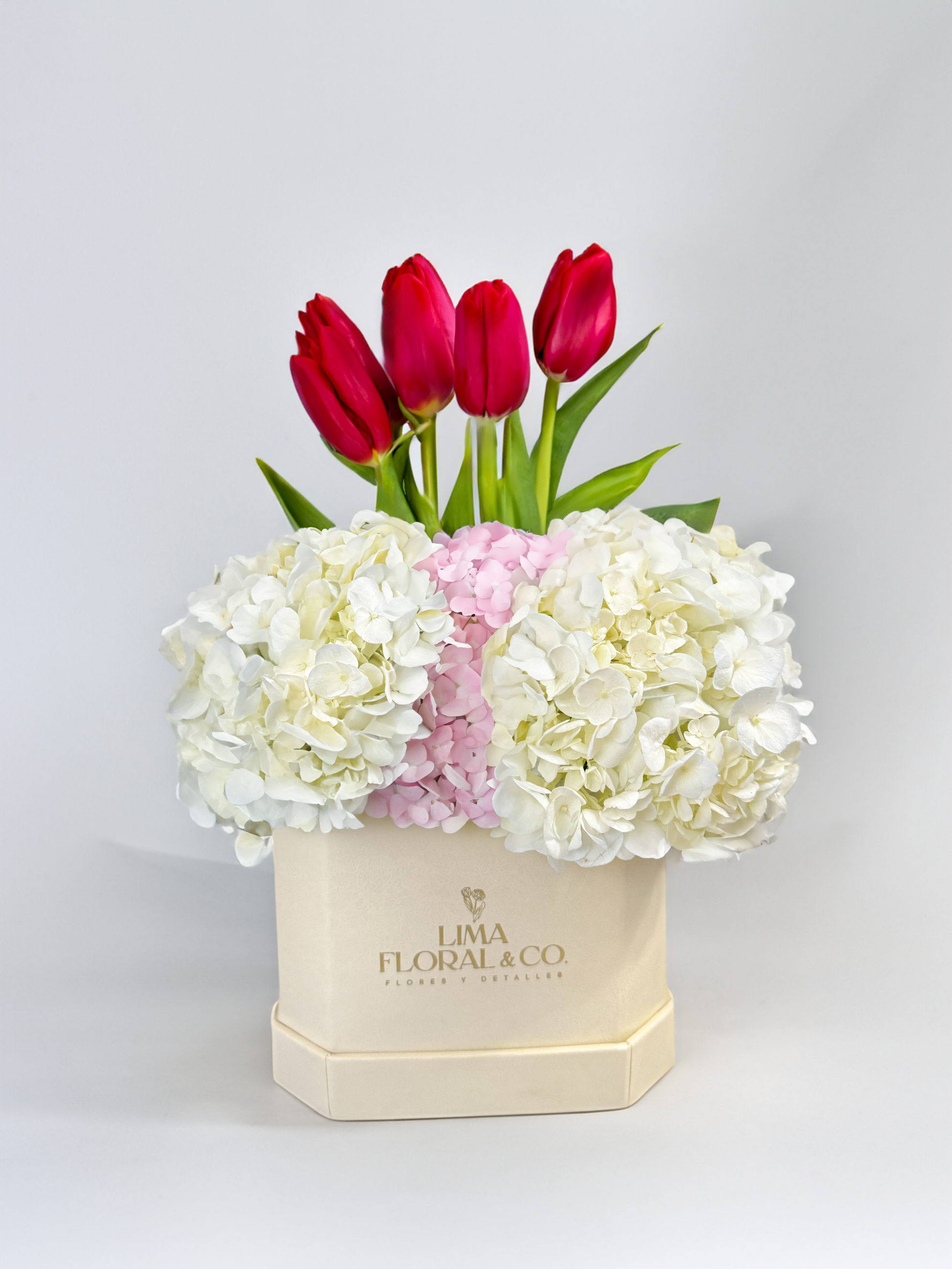 Un box elegante y fresco que combina hortensias en tonos blancos y rosados, con el toque alegre de cuatro tulipanes multicolor.
