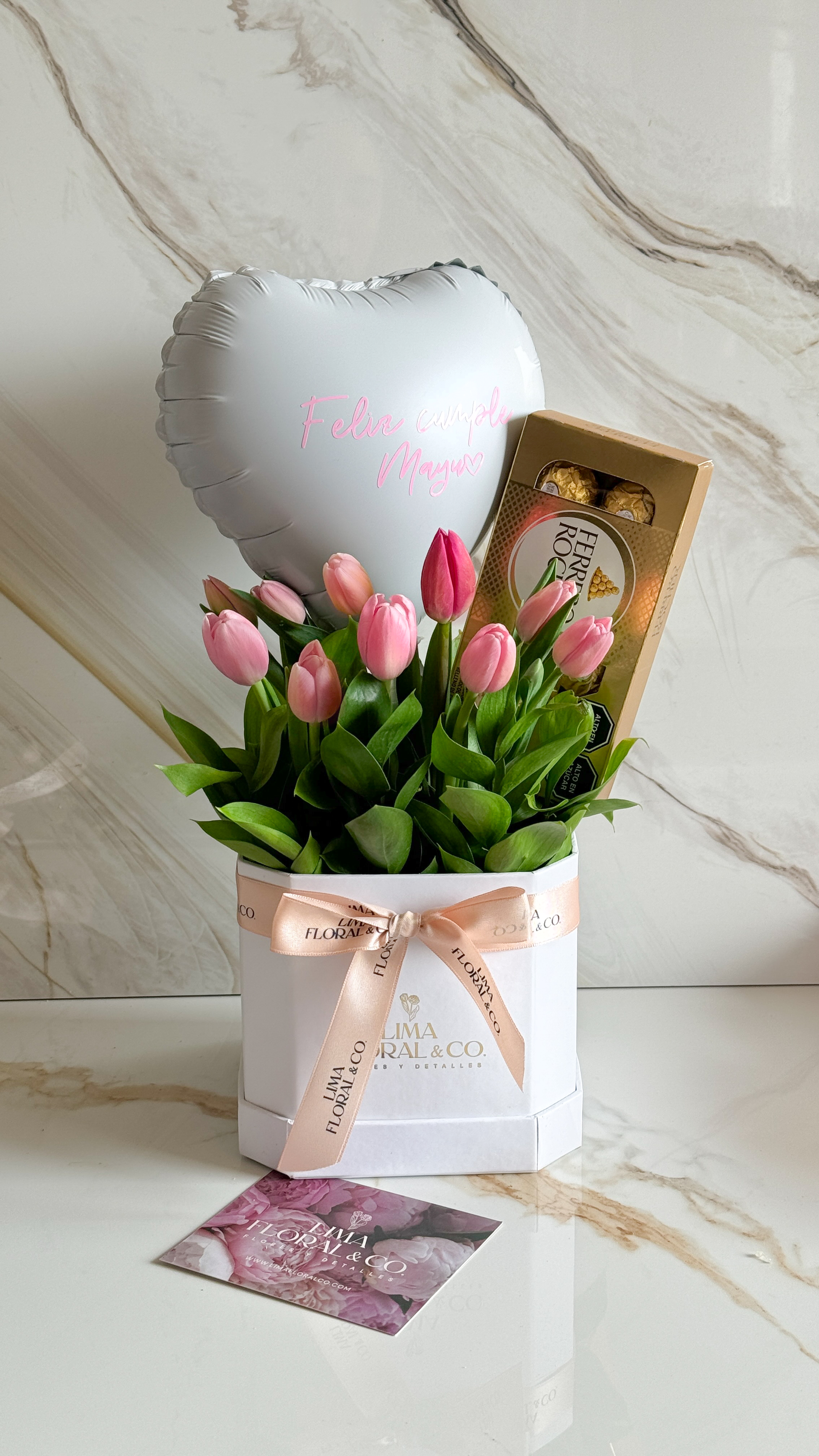 Un detalle especial para iluminar el día: 10 hermosos tulipanes multicolor acompañados de un globo personalizado y deliciosos chocolates. Perfecto para expresar amor y endulzar ese momento especial.