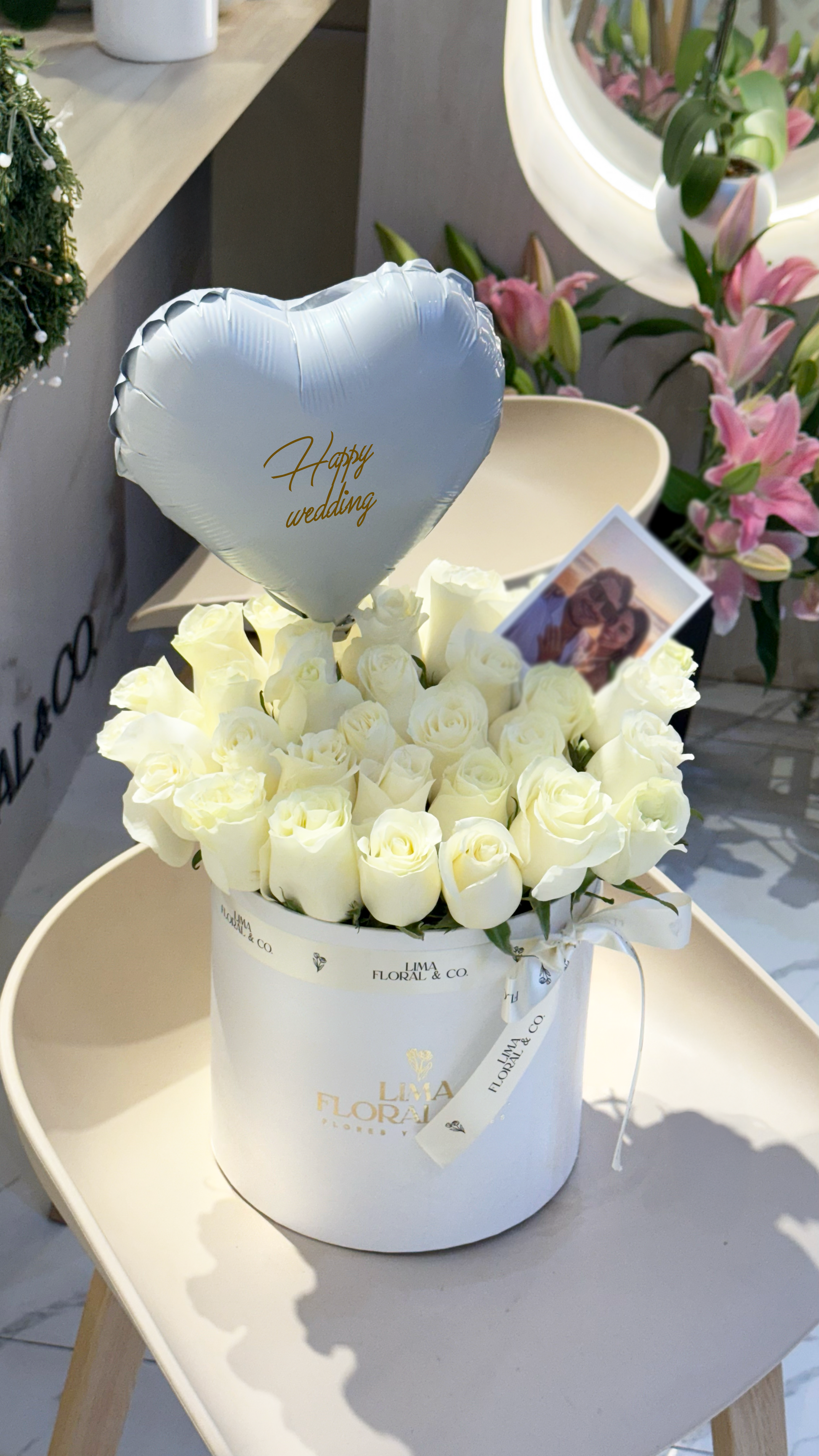 Box Lima Floral que contiene 30 rosas blancas, perfecta para transmitir la alegría de este día tan especial. Incluye un globo metálico, una tarjeta de dedicatoria, una foto estilo polaroid y papelería de la marca.