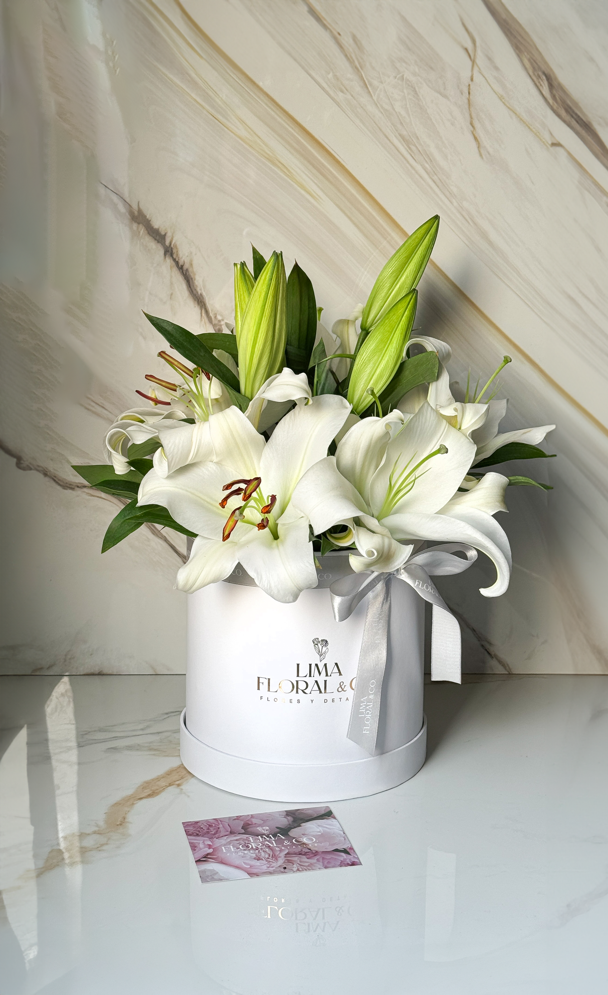 10 Lirios y fino follaje en elegante box. Incluye globo metálico, tarjeta de dedicatoria y papelería de la marca. Un detalle muy especial.