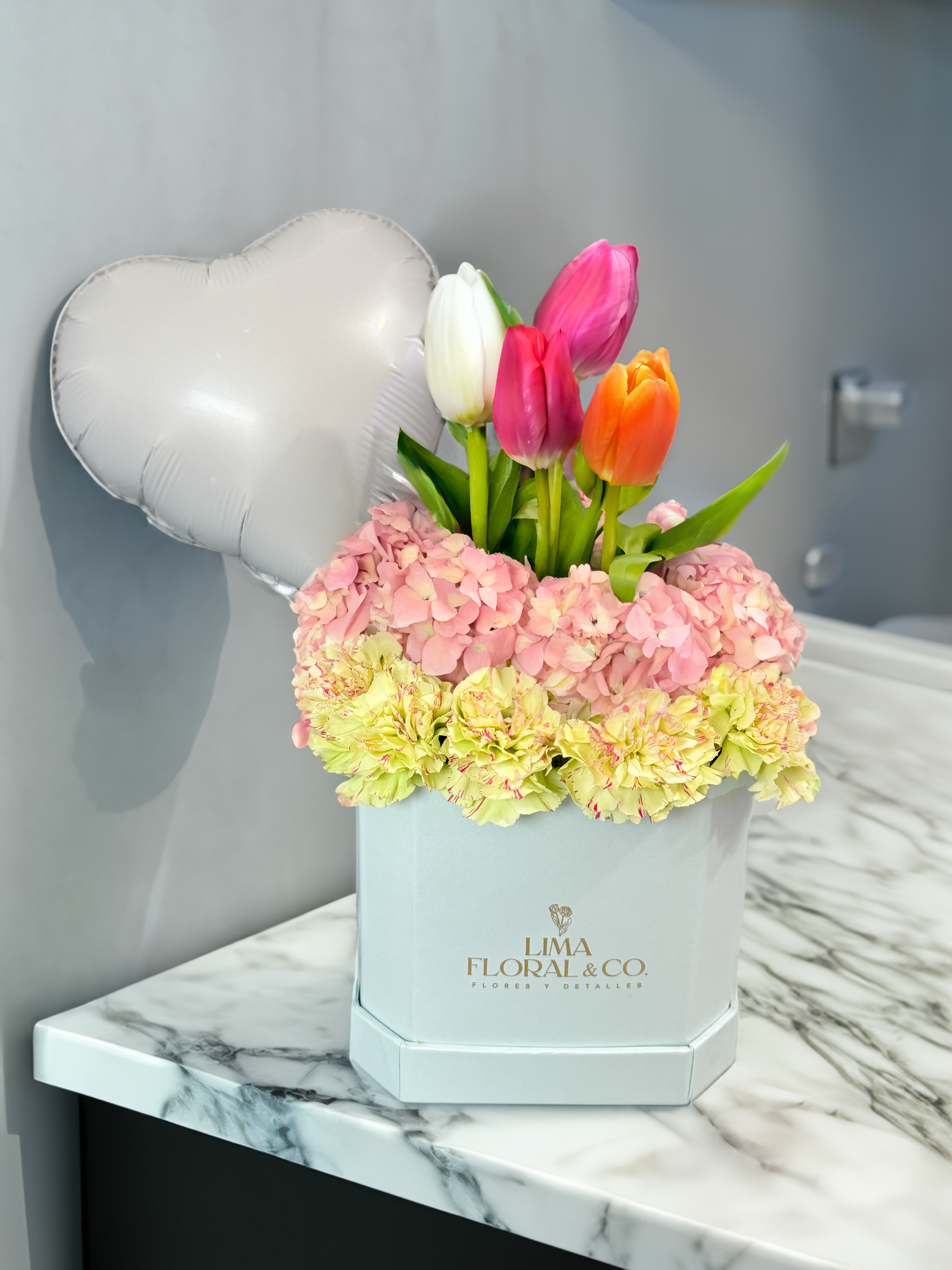 Un arreglo lleno de ternura y encanto, con claveles y hortensias en suaves tonos rosados que transmiten calidez y dulzura. Los tulipanes multicolor añaden un toque vibrante y especial, perfecto para iluminar cualquier ocasión. Incluye globo y tarjeta de dedicatoria, ideal para sorprender con un detalle único.