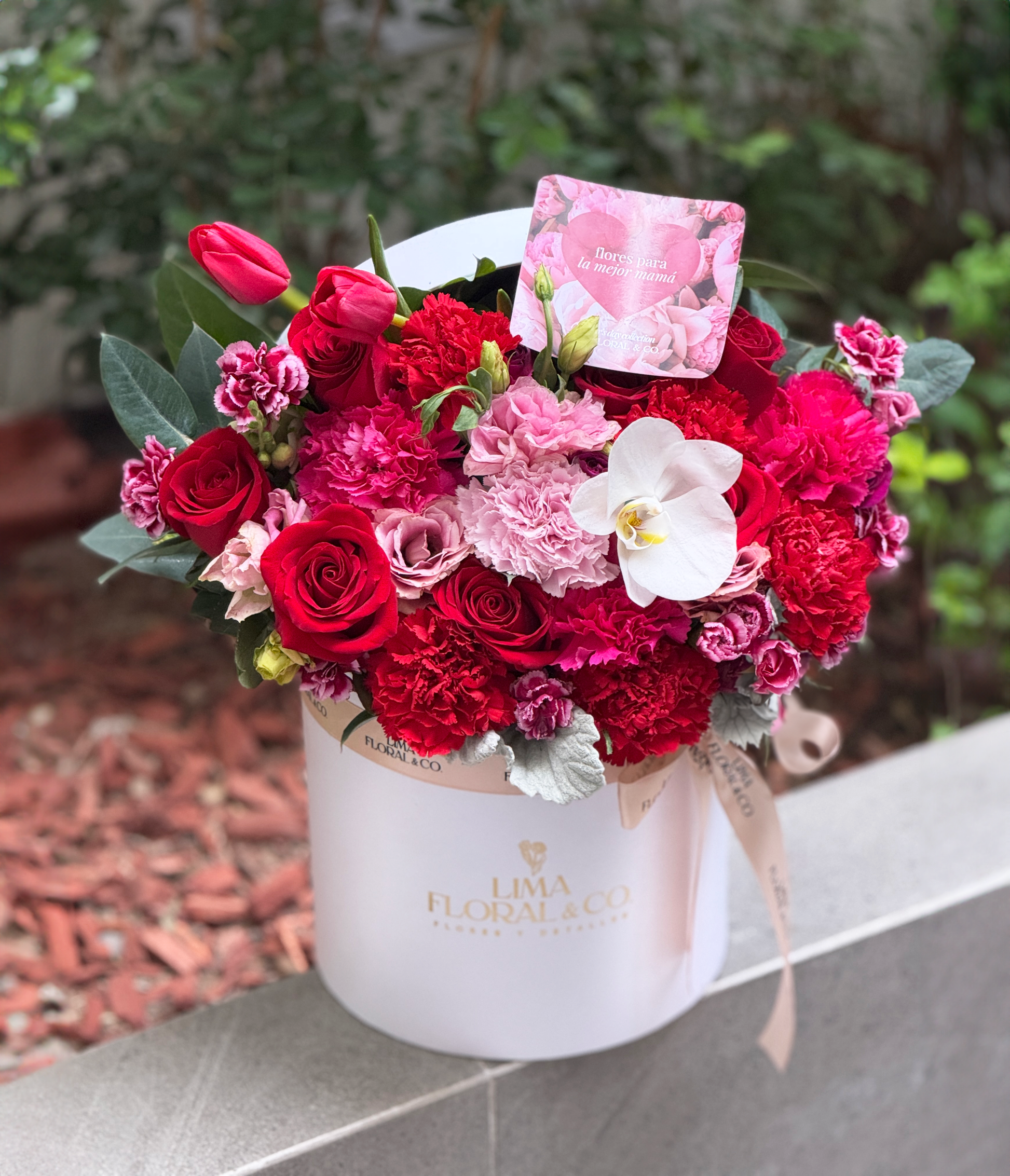 Un diseño elegante y colorido con claveles importados, mini claveles, rosas rojas, lisianthus, orquídea y 2 tulipanes. Incluye tarjeta de dedicatoria y globo de regalo.