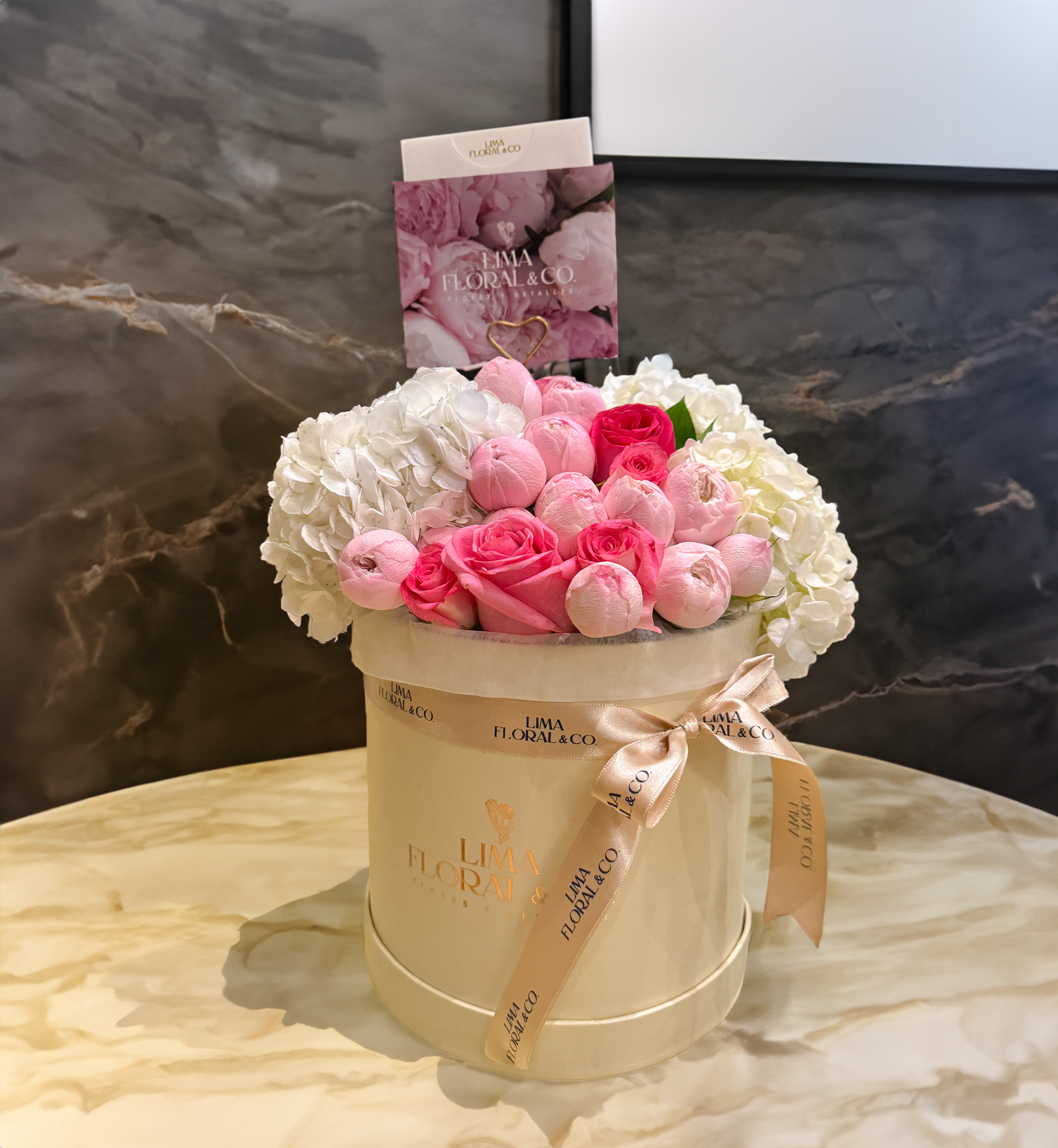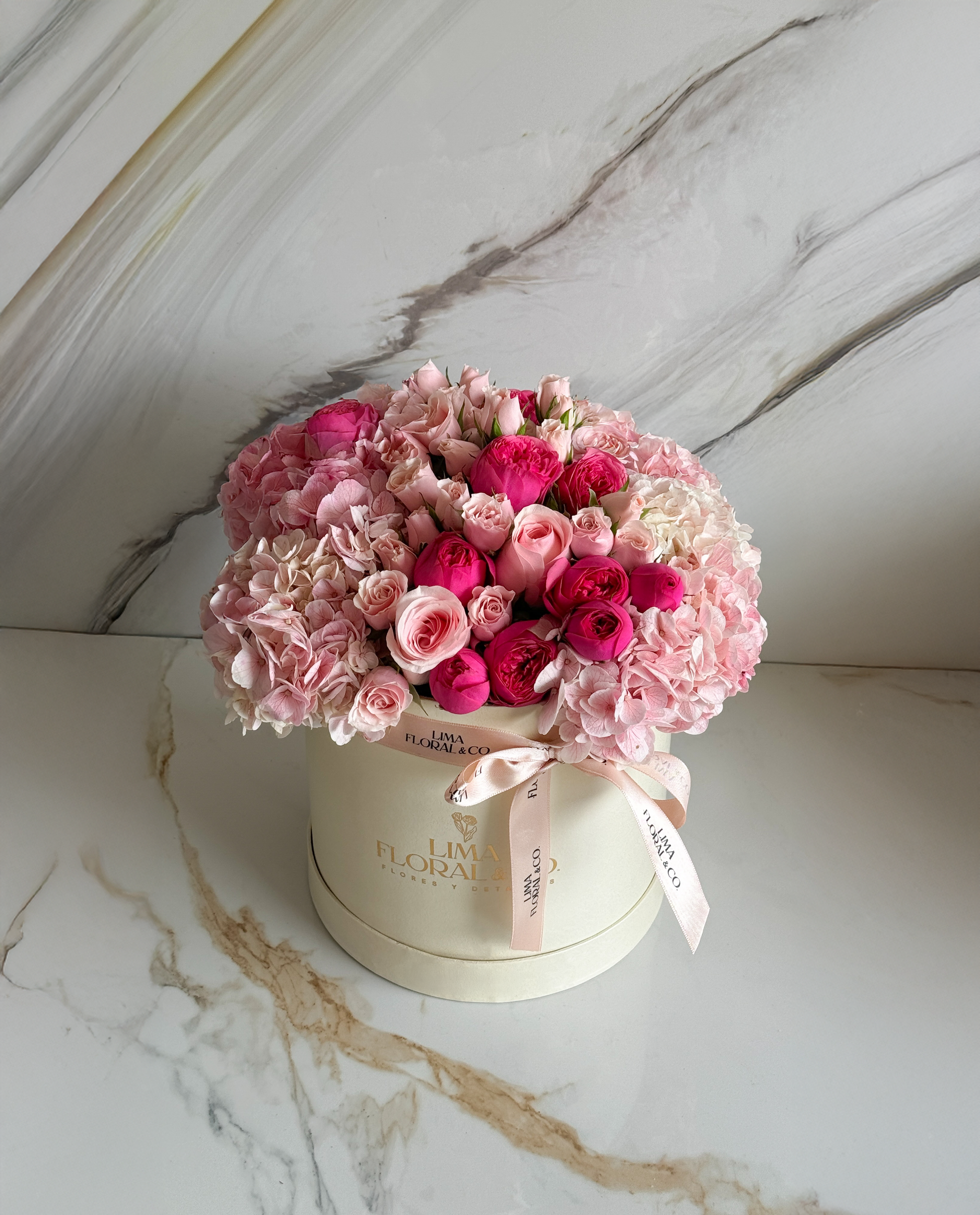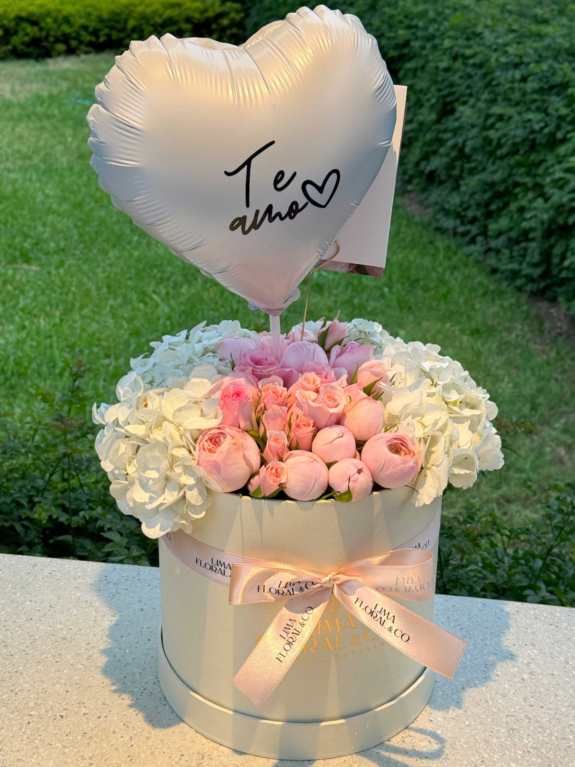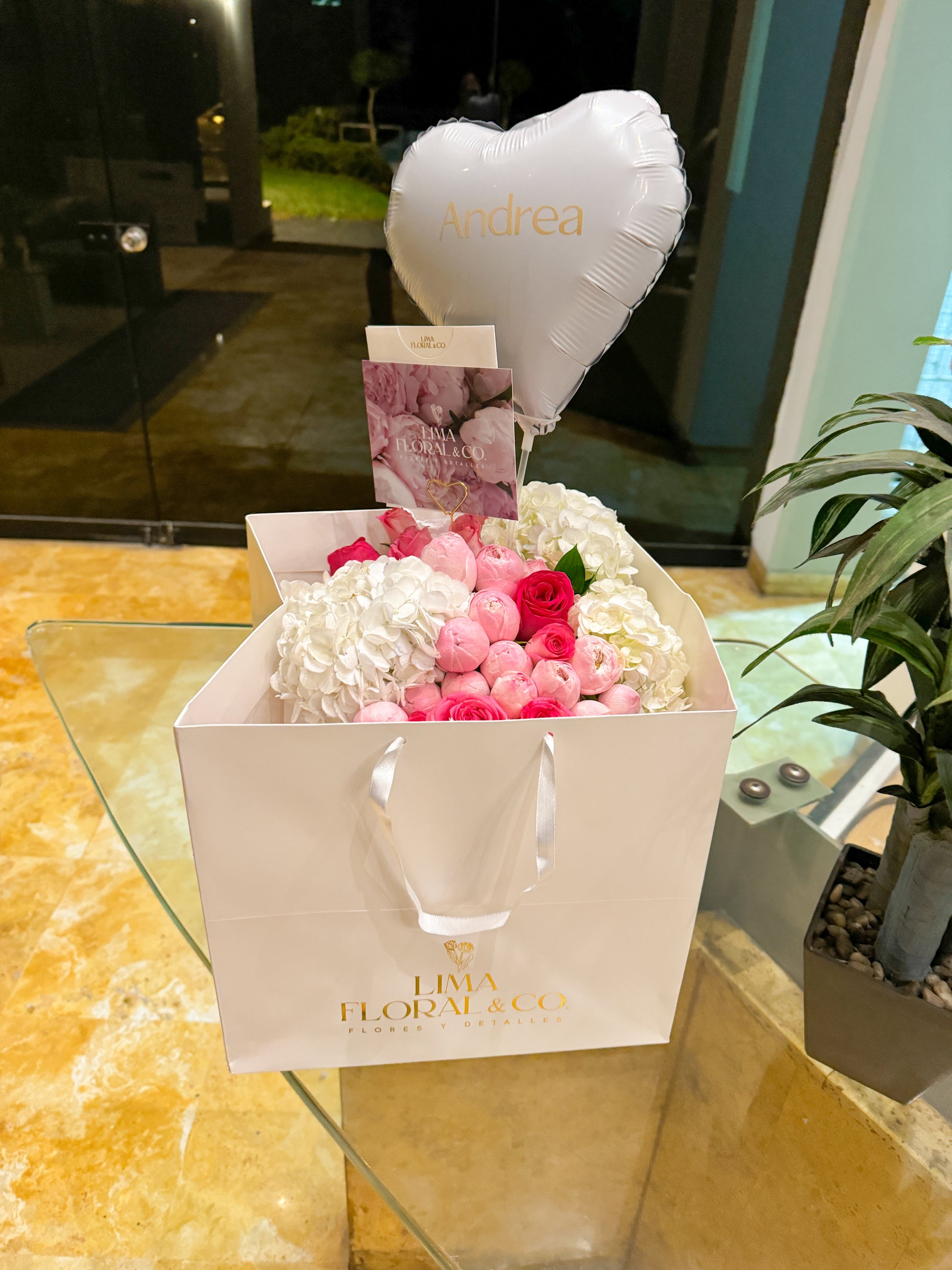 Este arreglo combina abundantes rosas inglesas, hortensias, mini rosas y rosas en una exquisita presentación, desde la bolsa, hasta la tarjeta de dedicatoria, cintas y el globo, todo cuidadosamente seleccionado para una experiencia verdaderamente premium.