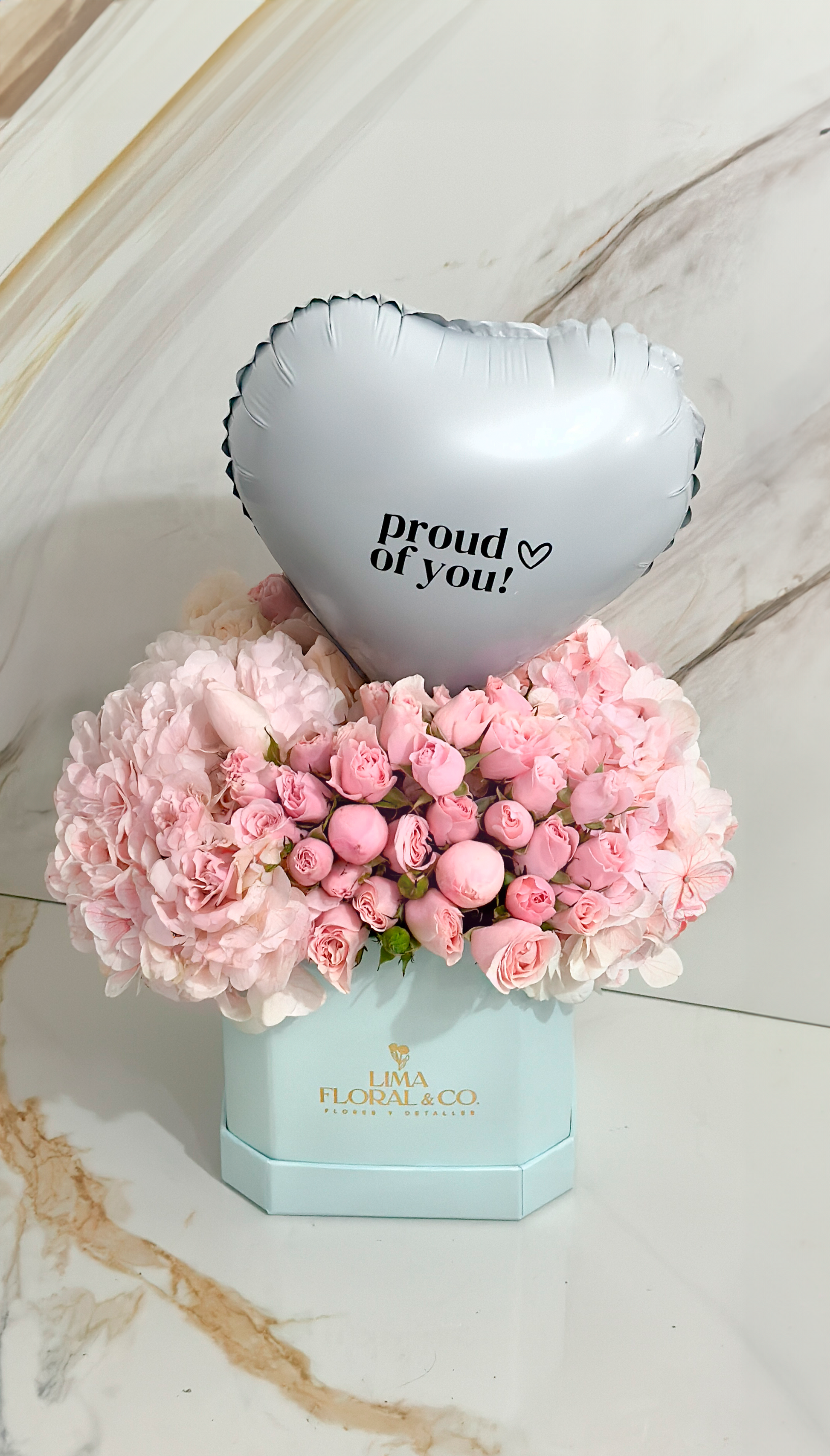 Celebra los momentos más especiales con nuestro encantador Box Proud, una celebración floral perfecta que combina rosas inglesas, mini rosas y hermosas hortensias, todo en suaves tonos rosados. Este exclusivo diseño es ideal para regalar en graduaciones, cumpleaños o cualquier ocasión que merezca ser recordada.
