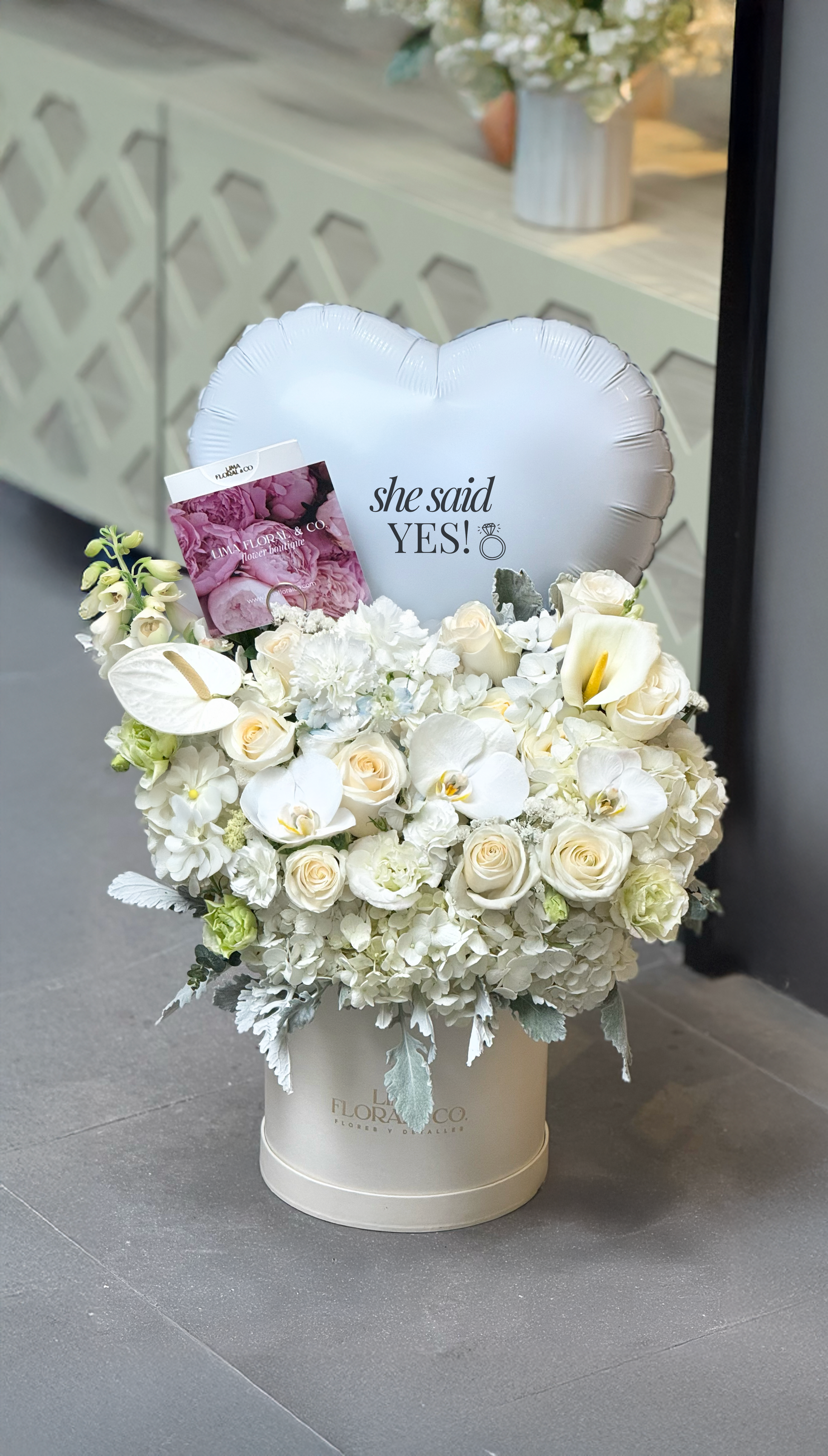 Incluye: hortensias, rosas, orquídeas, calas y anturio. Todo esto, acompañado de un globo grande de regalo que realza su espectacular presentación.