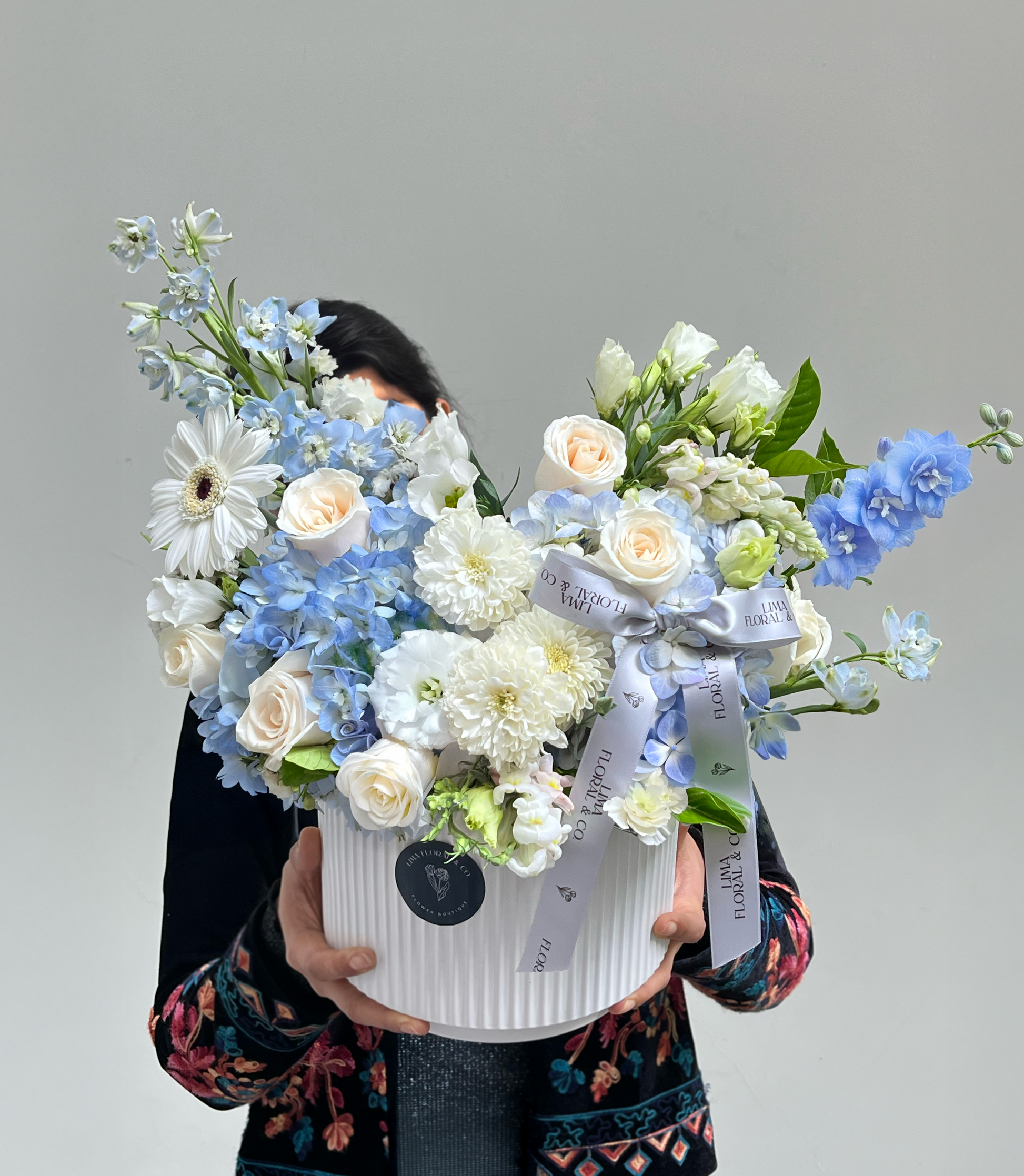 Un arreglo tierno y elegante en base de cerámica, diseñado para dar la bienvenida a un nuevo bebé con mucho amor. Incluye una delicada combinación de hortensias celestes, delphinium, rosas blancas, claveles y lisianthus, todo en suaves tonos celeste, verde y blanco. Perfecto para celebrar un nacimiento y alegrar a la nueva familia con flores frescas y llenas de significado. Ideal para sorprender en clínica, casa o sesión de fotos.