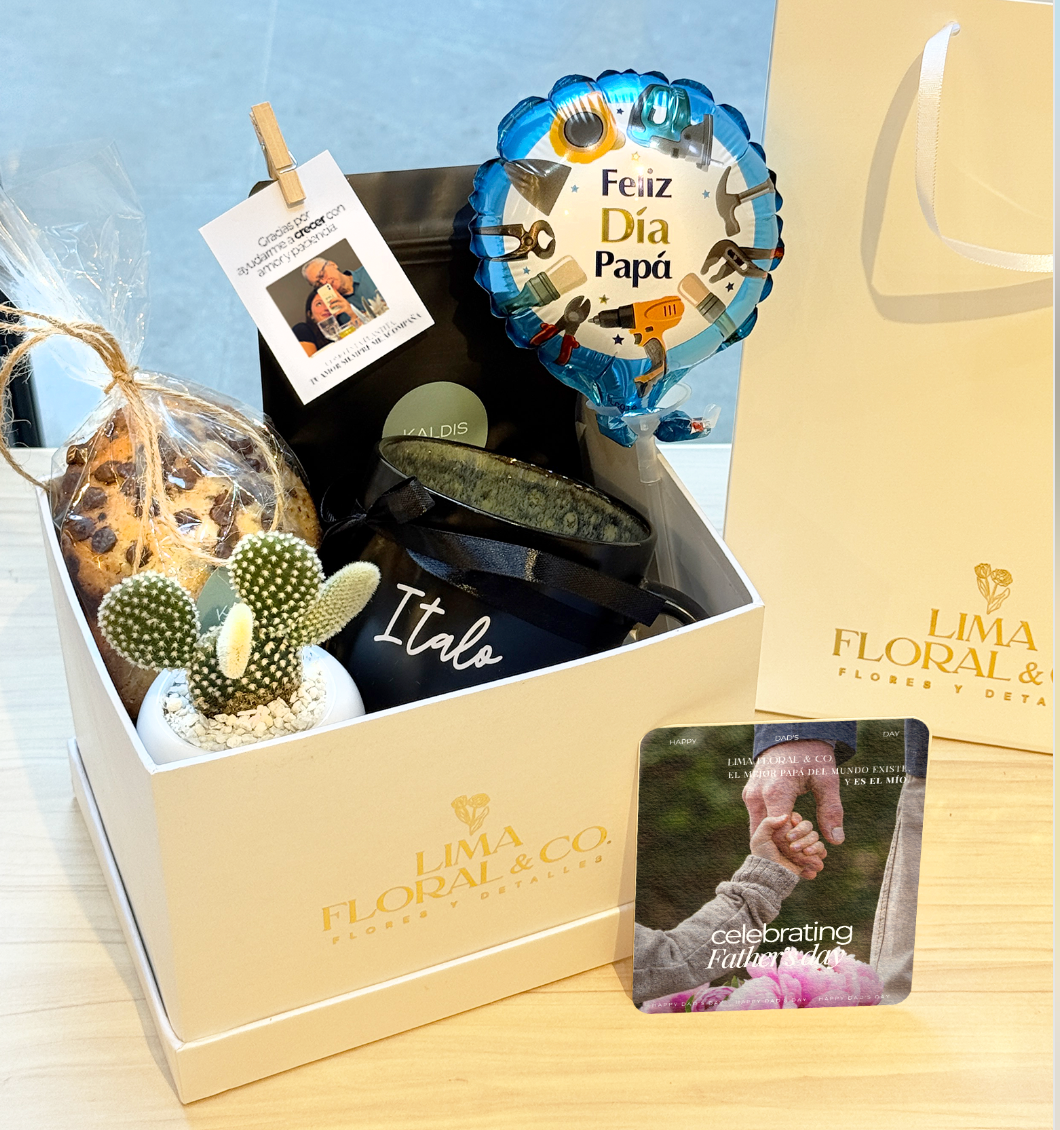Incluye: Café Kaldis en grano (100 g), taza personalizada, galletas Kaldis y una mini suculenta decorativa. Empacado en caja Lima Floral, ideal para regalo.