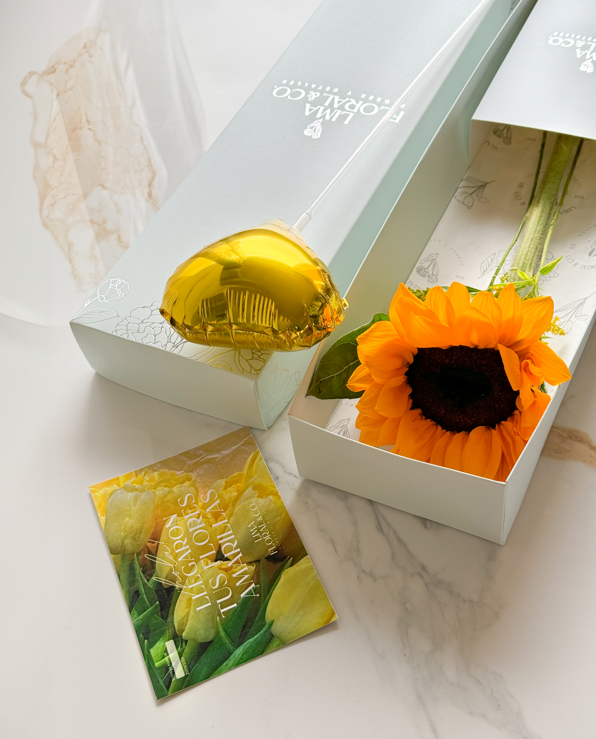 Ilumina el día de esa persona especial con una caja de alegres girasoles. Cada caja incluye un globo de corazón de cortesía, una tarjeta para tu mensaje especial y papelería exclusiva de nuestra marca.