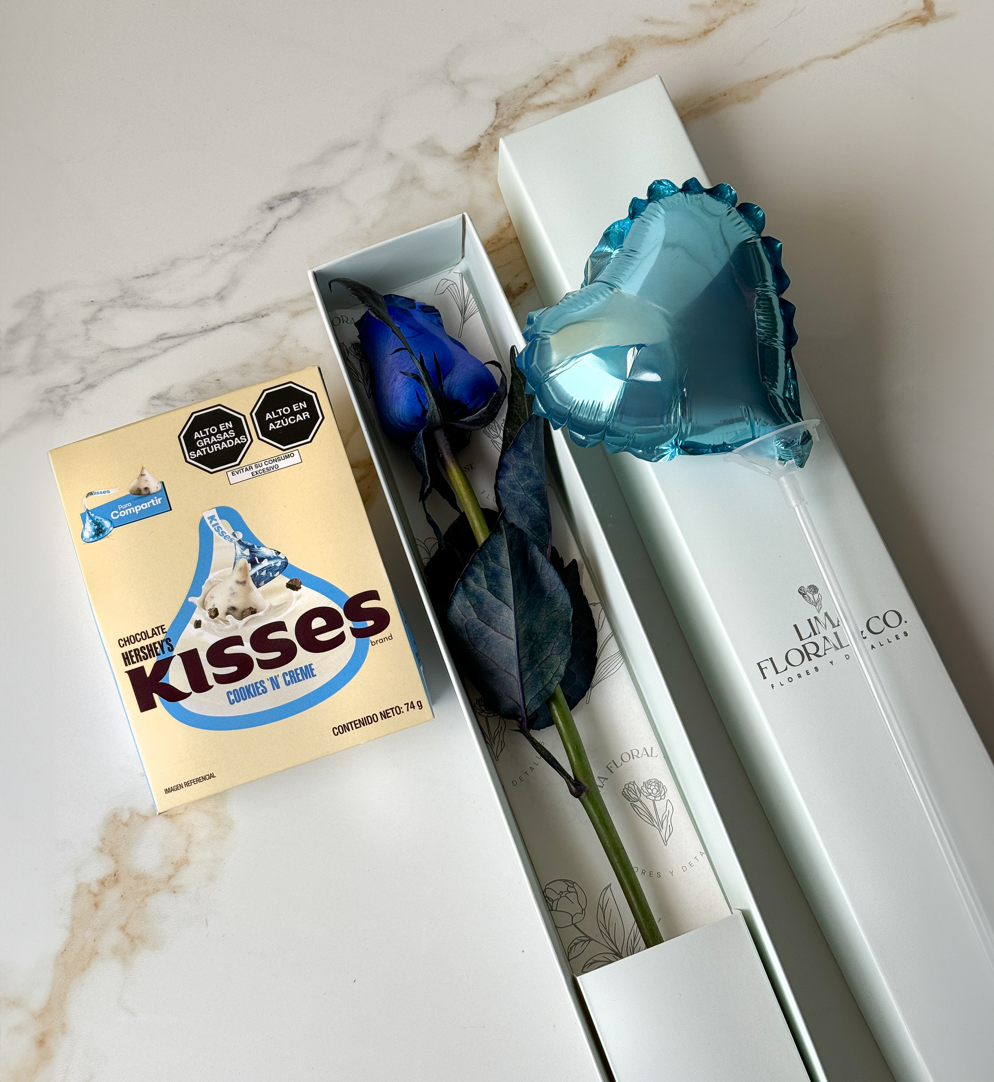 Caja con 1 rosa azul y caja de chocolates, incluye globo y nuestra exclusiva papelería de marca con tarjeta de dedicatoria personalizada.