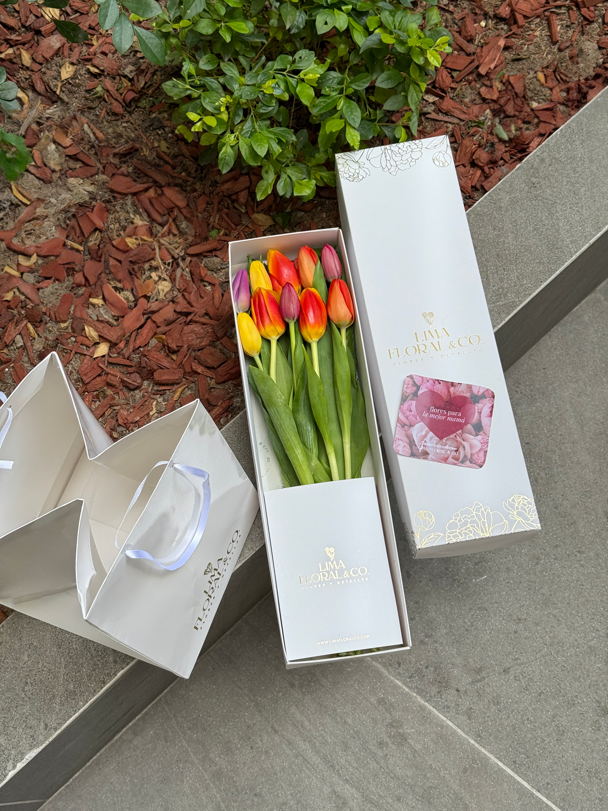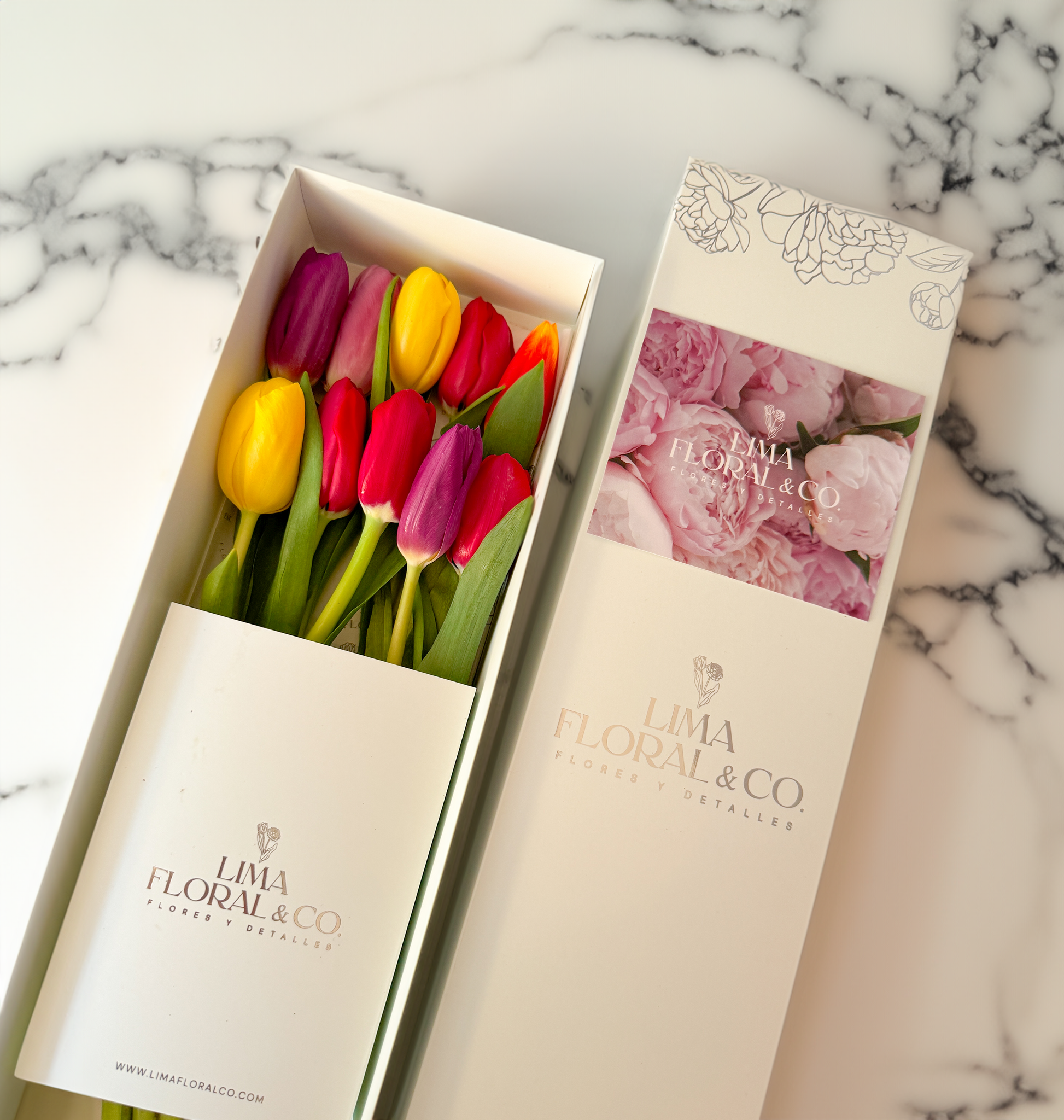 Regala una caja de tulipanes frescos y hermosos. Cada caja incluye un globo de corazón de cortesía, una tarjeta para tu dedicatoria especial y papelería exclusiva de nuestra marca.