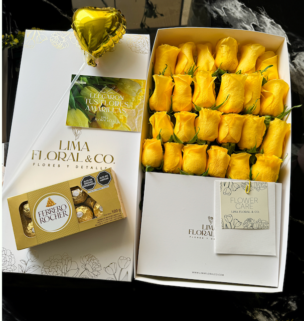 Un detalle inolvidable: 24 rosas amarillas en nuestra exclusiva caja Lima Floral, acompañadas de deliciosos chocolates Ferrero Rocher. El regalo perfecto para sorprender y endulzar el día de quien más quieres.