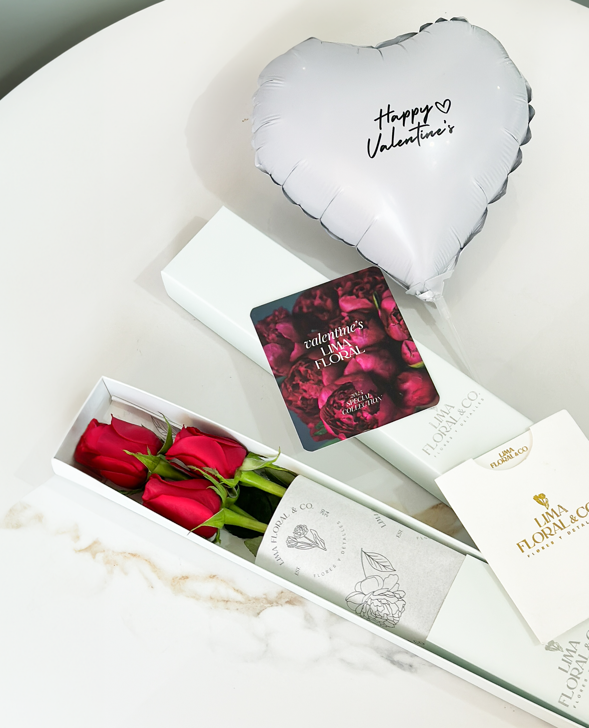 Cada caja incluye un globo de corazón de cortesía, una tarjeta para tu dedicatoria especial y papelería exclusiva de nuestra marca.