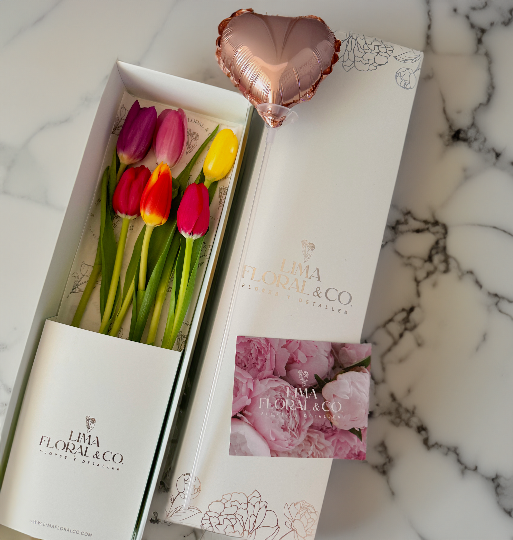 Regala una caja de tulipanes frescos y hermosos. Cada caja incluye un globo de corazón de cortesía, una tarjeta para tu dedicatoria especial y papelería exclusiva de nuestra marca.