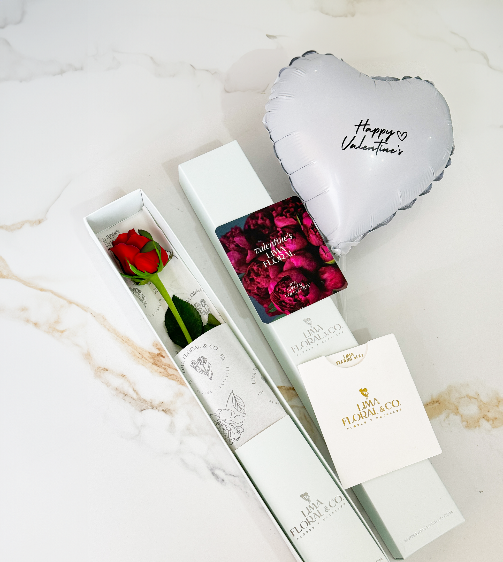 Cada caja incluye un globo de corazón de cortesía, una tarjeta para tu dedicatoria especial y papelería exclusiva de nuestra marca.