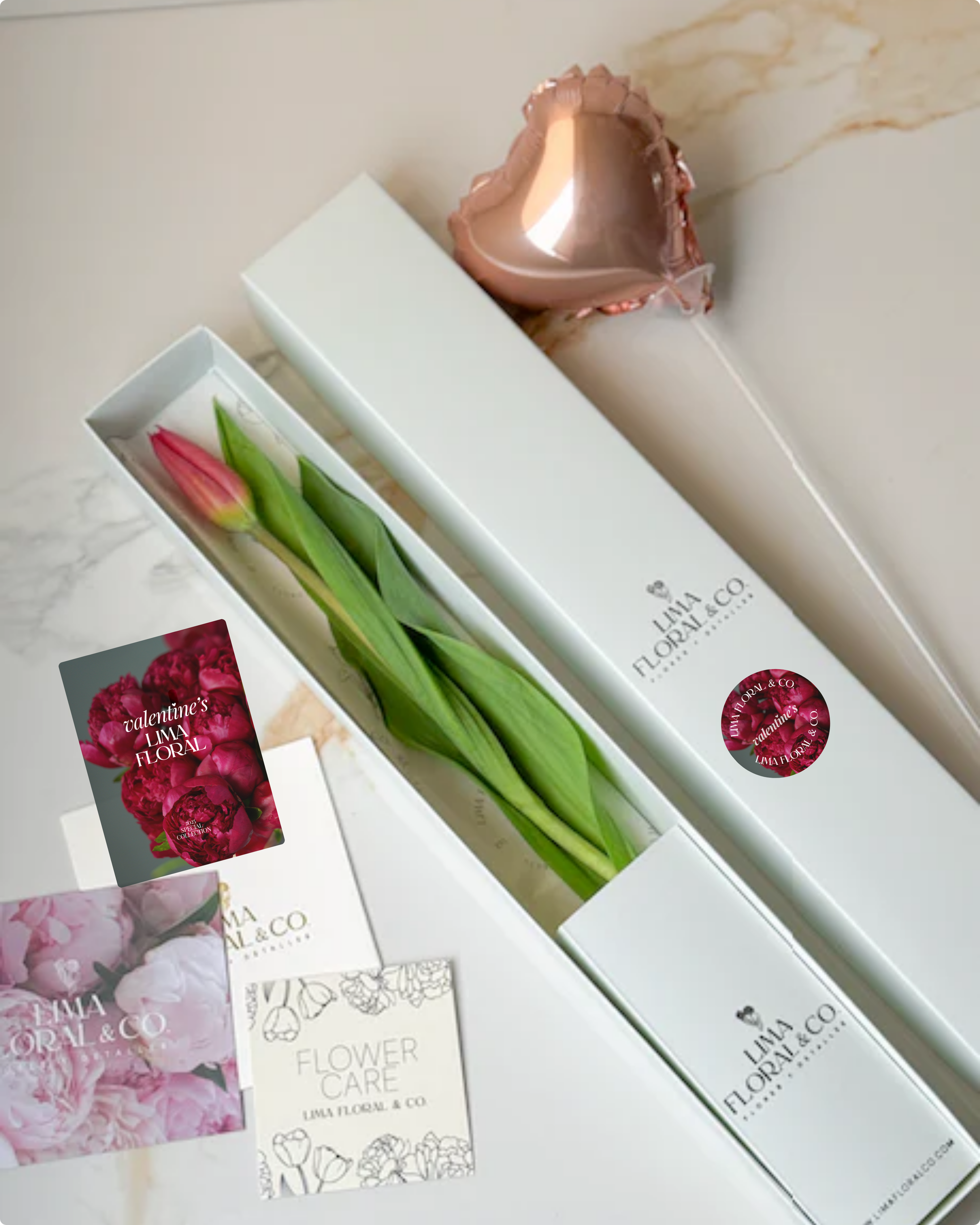 Regala una caja de tulipanes frescos y hermosos. Cada caja incluye un globo de corazón de cortesía, una tarjeta para tu dedicatoria especial y papelería exclusiva de nuestra marca. ¡Haz su día aún más especial con este detalle lleno de amor!