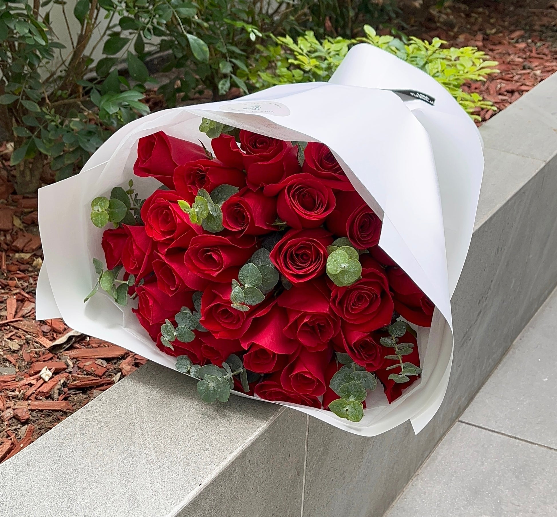30 rosas rojas intensas con follaje, envueltas en nuestro estilo moderno de forrado.