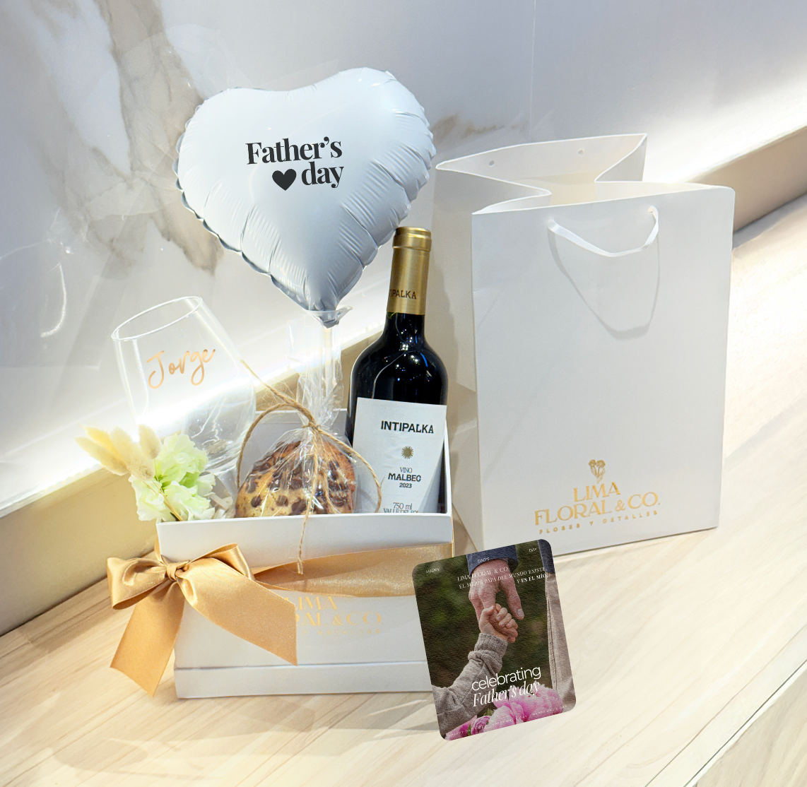 Incluye: Vino Intipalka, copa de vino personalizada con su nombre o frase especial y galletas Kaldis de chocolate. Todo presentado en nuestra caja Lima Floral.
