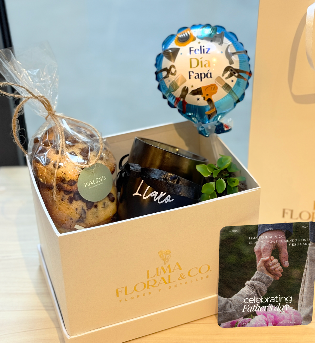 Incluye: Taza personalizada con su nombre o mensaje especial y galletas Kaldis recién horneadas. Viene en nuestra caja Lima Floral, lista para entregar.