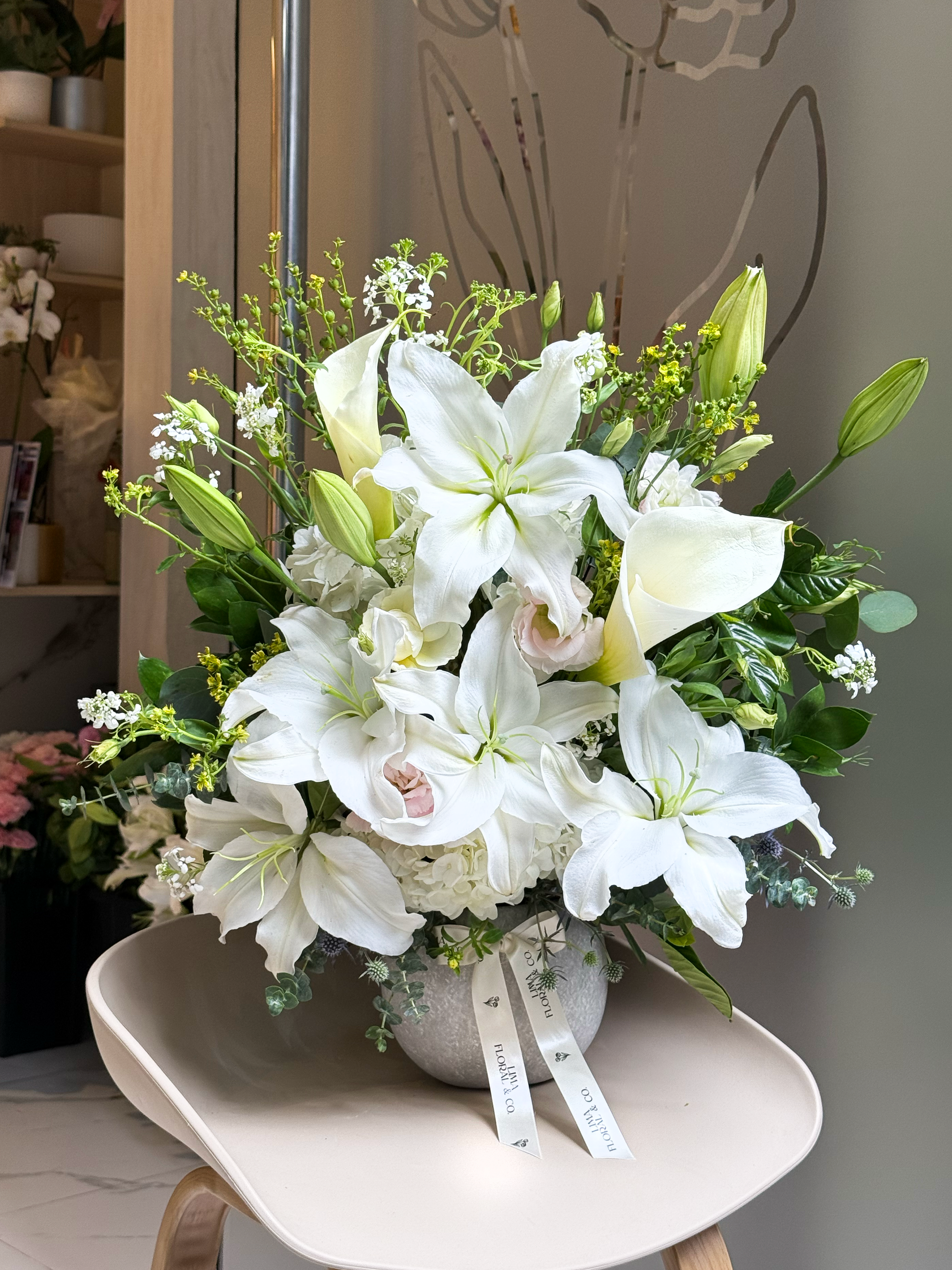 La Esfera Calla Lily combina lirios blancos, cartuchos y flores complementarias en una base de cerámica que aporta movimiento, luz y armonía.