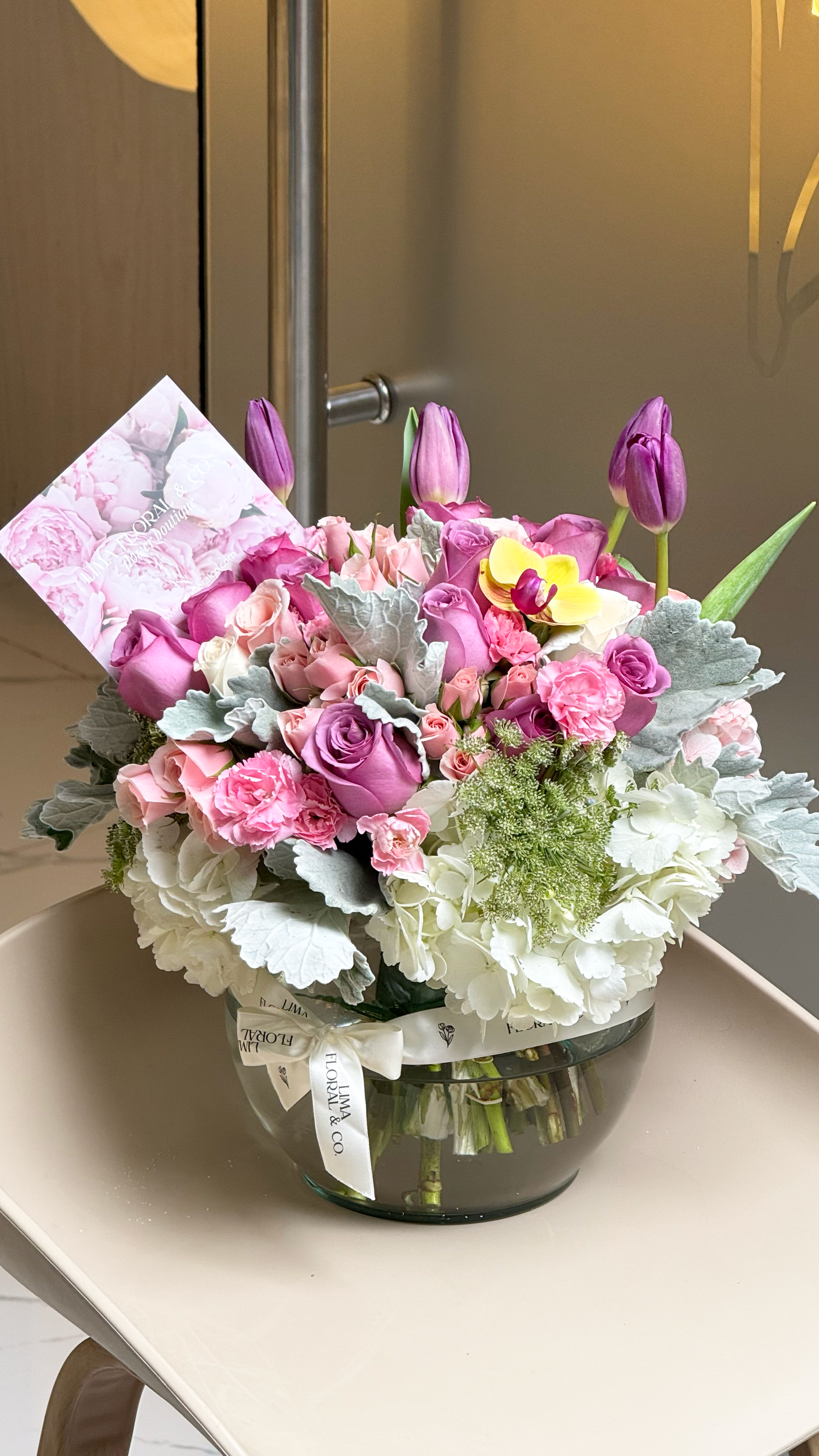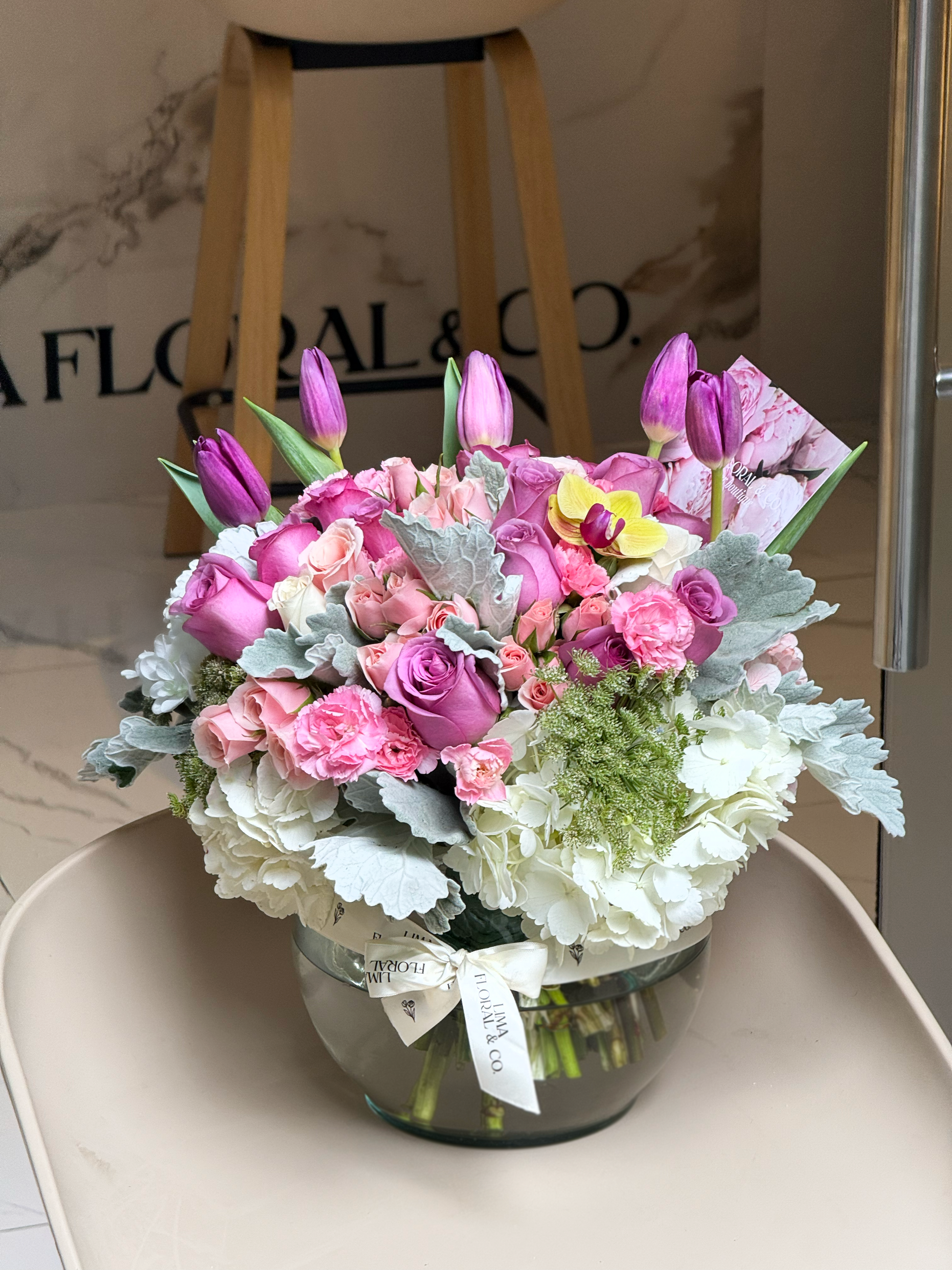 Un arreglo grande en esfera de vidrio, con un diseño moderno y elegante. Tulipanes morados, rosas lila, hortensias, margaritas y claveles importados.