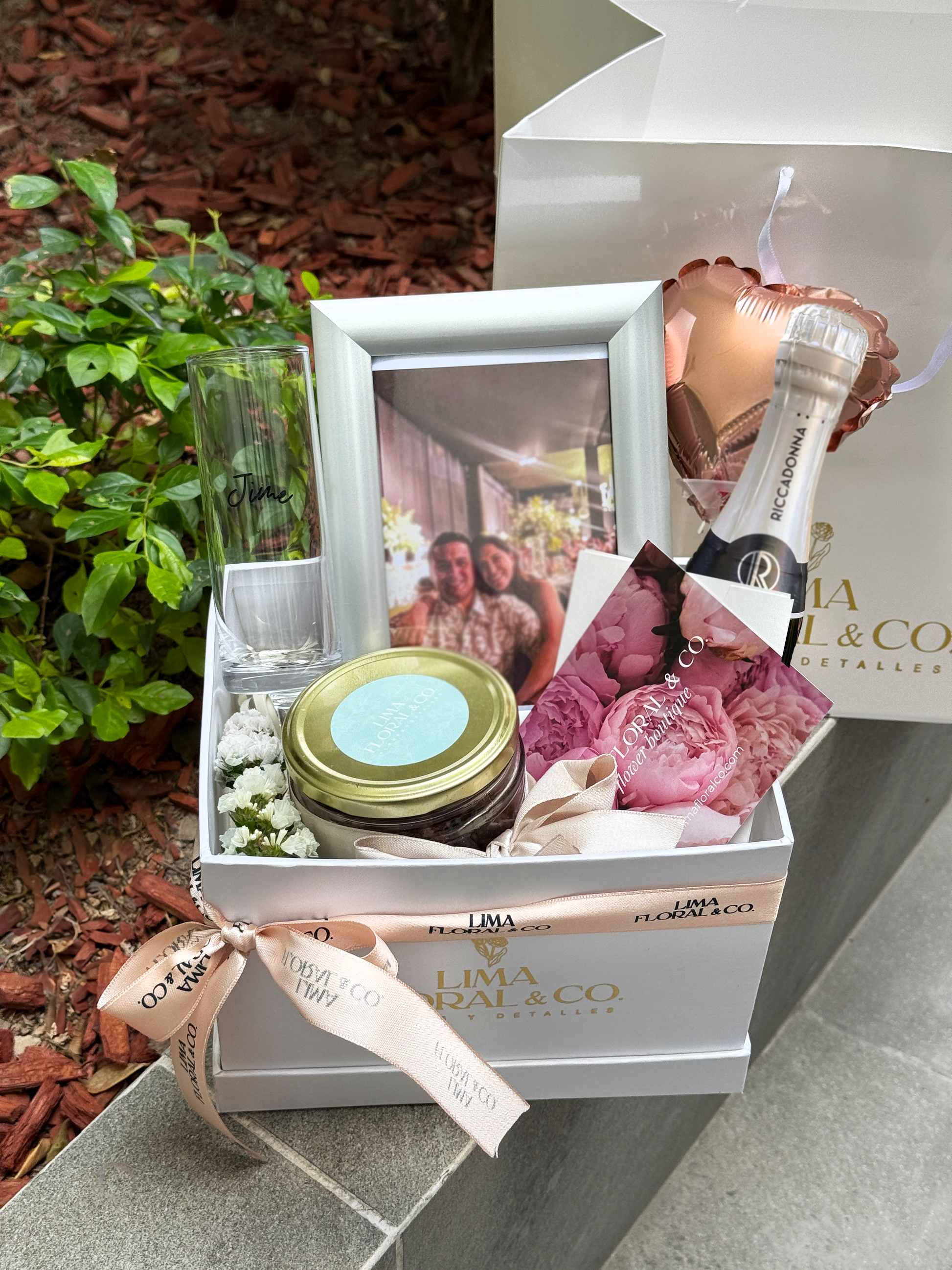 Un detalle exclusivo para celebrar momentos especiales: incluye un cuadro con foto personalizada, un delicioso jar de brownies y un mini champagne Riccadonna.