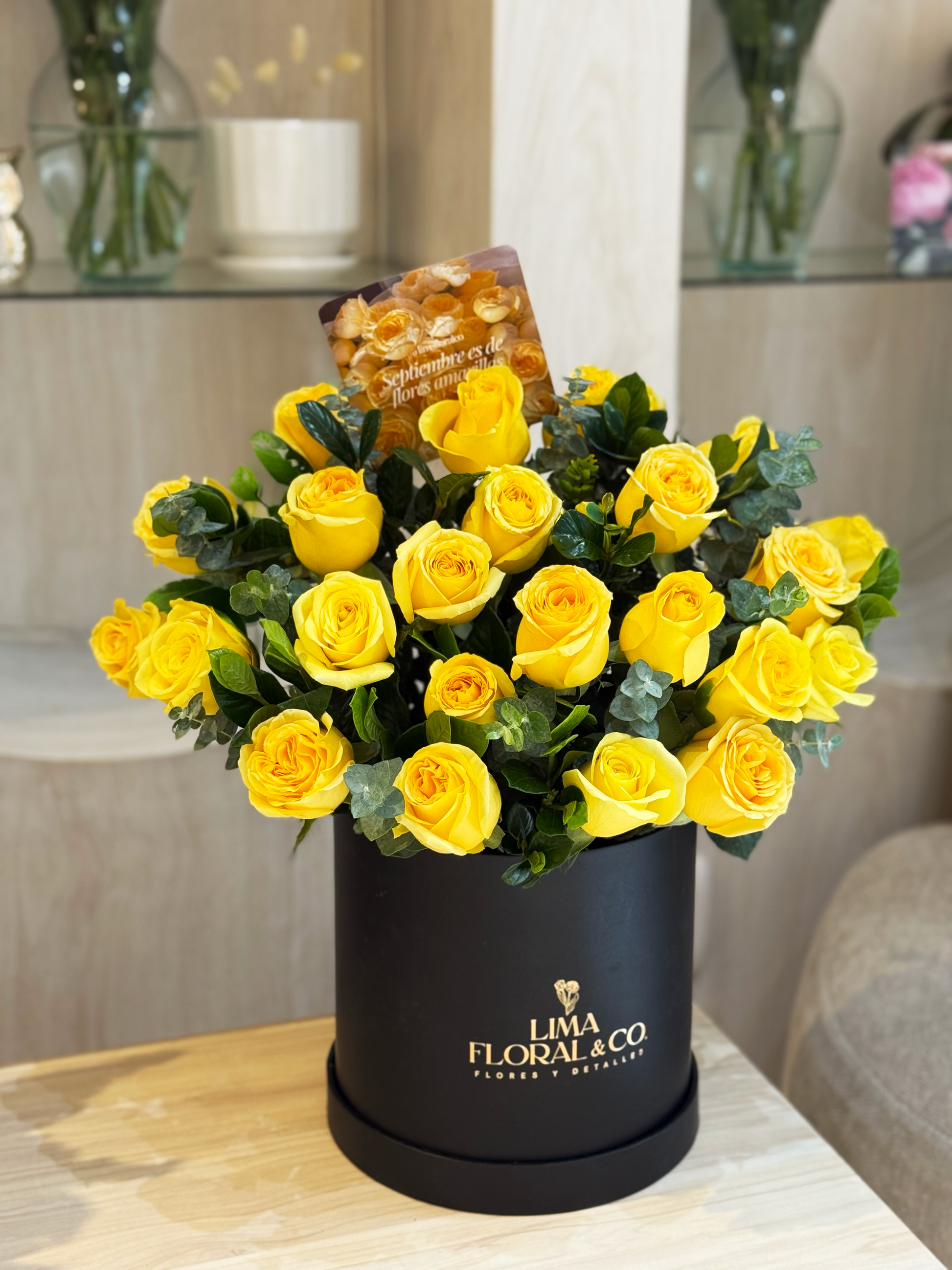Clásico y elegante. Rosas amarilas que alegran cualquier espacio en nuestra icónica caja negra.