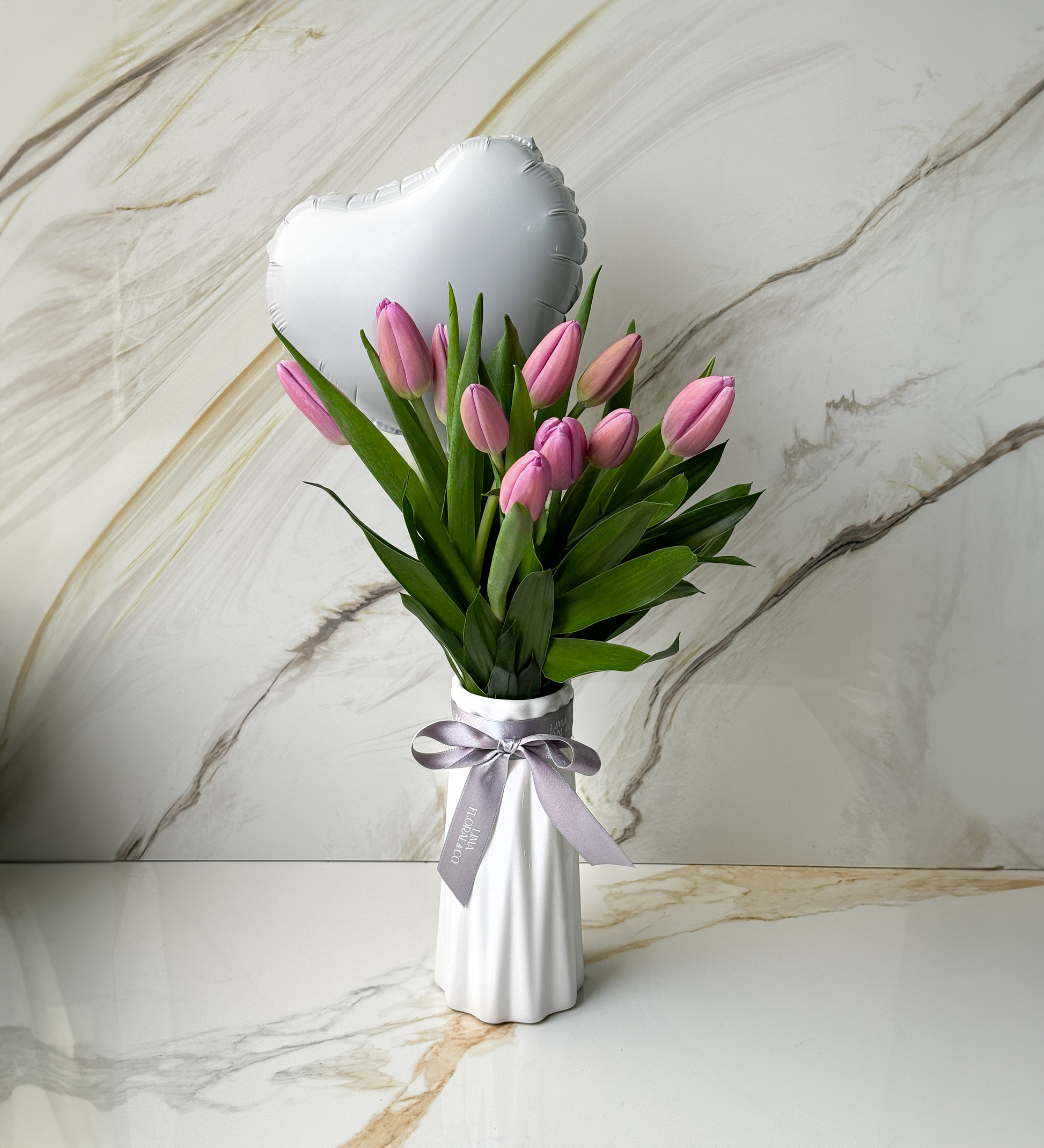 Jarrón clásico de 10 tulipanes multicolor con fino follaje. Incluye globo metálico, tarjeta de dedicatoria y papelería de la marca.