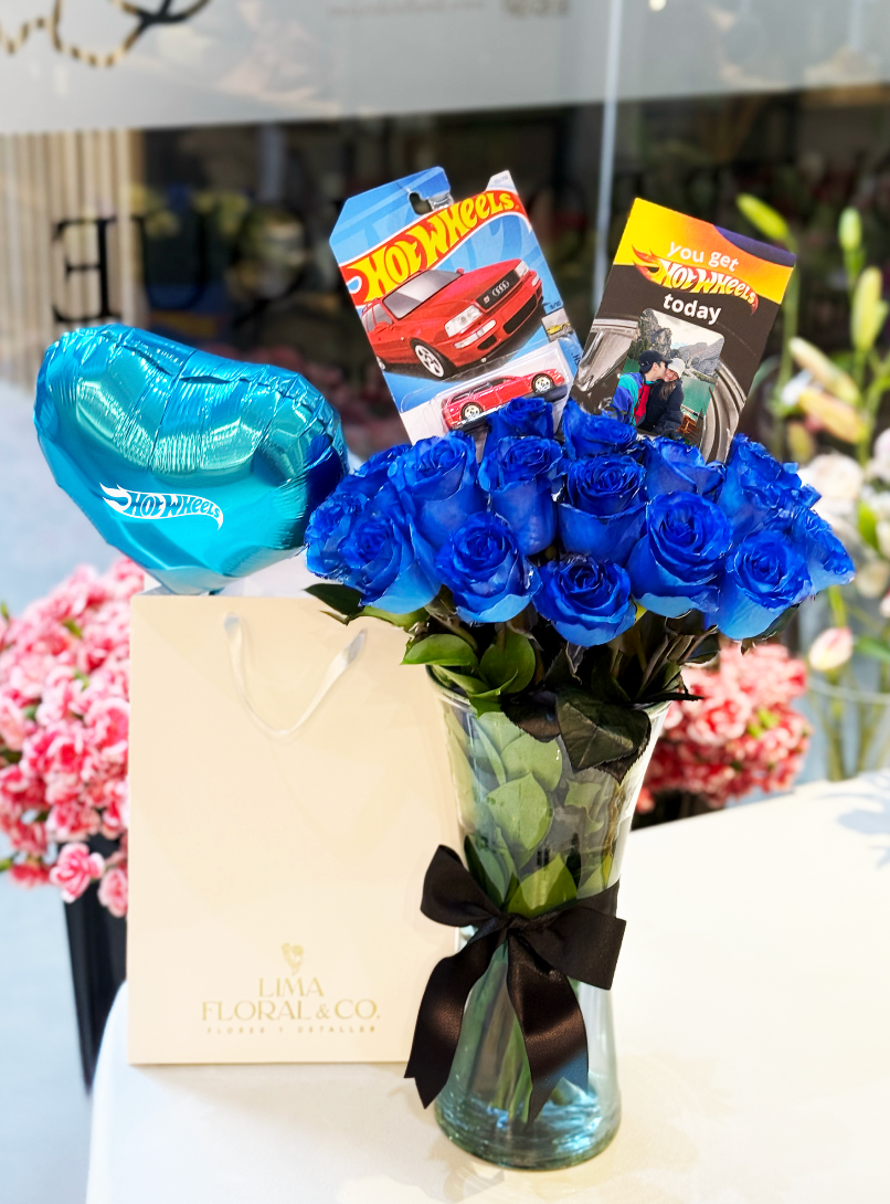 Jarrón 24 Rosas Azules + Carrito Hot Wheels