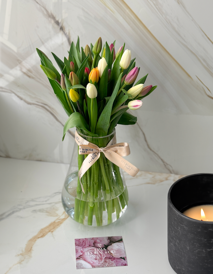 Personalización de Colores: Si deseas un color específico para los tulipanes, por favor consulta la disponibilidad. En caso contrario, enviaremos una selección multicolor que seguramente te encantará!