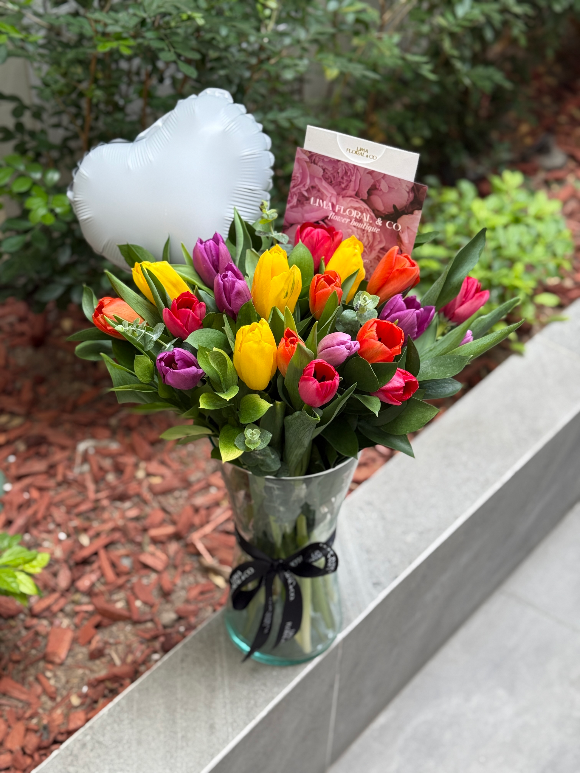 Un diseño llamativo con 20 tulipanes multicolor en un jarrón alto. Incluye globo de regalo. Ideal para quienes buscan impresionar!