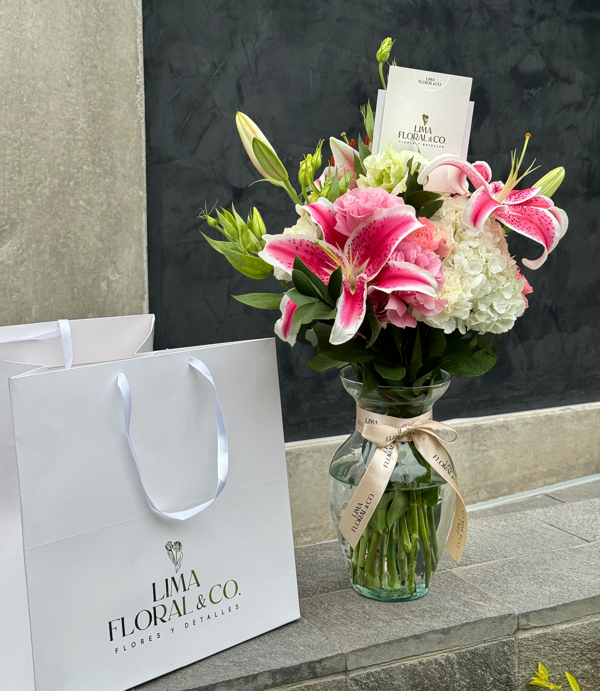 Jarrón Garden: Lirios, Lisianthus, Claveles y Rosas