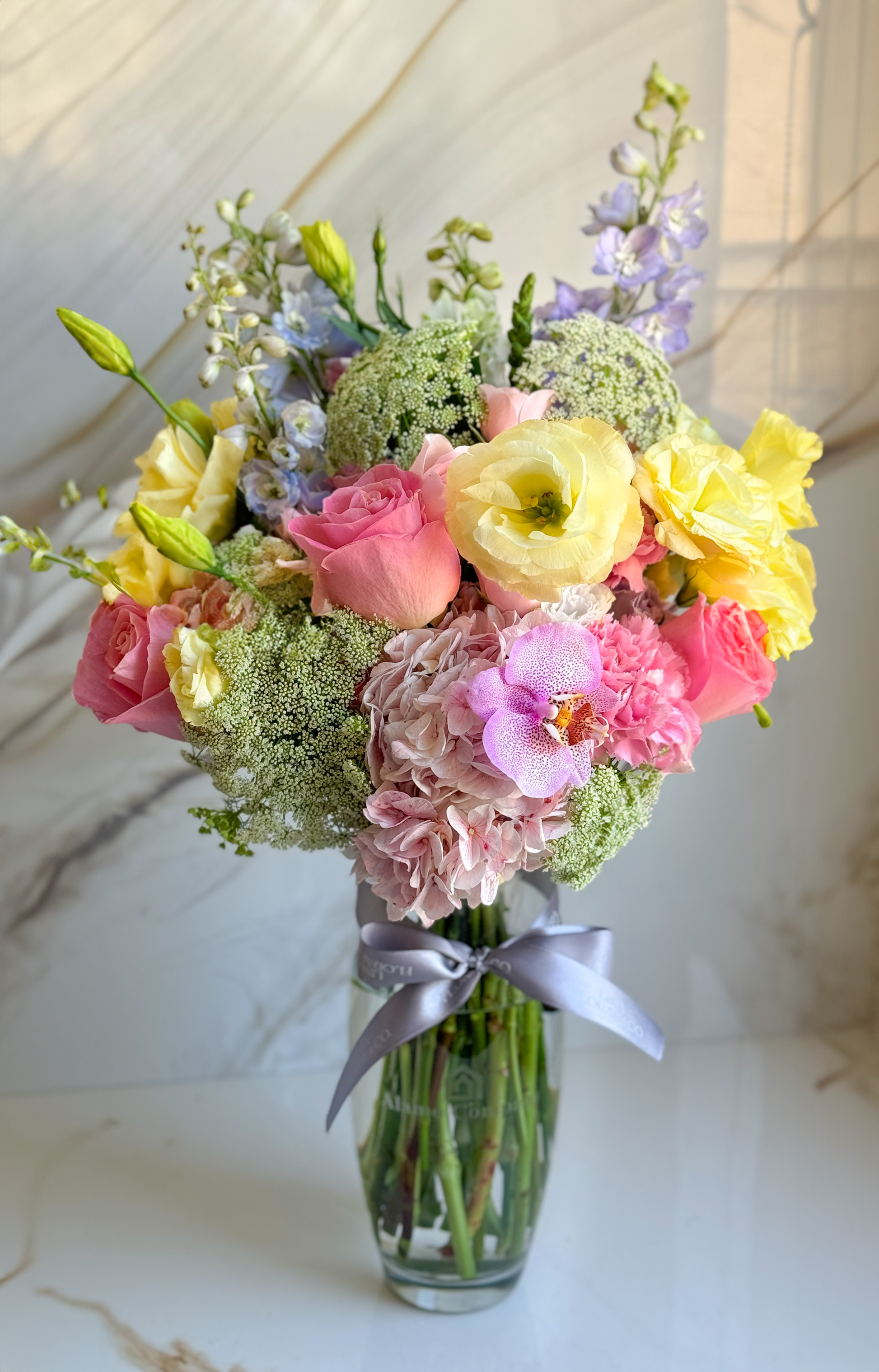 Una explosión de flores premium en tonos pasteles que llenarán cualquier ambiente de elegancia. Este jarrón incluye hortensias, lisianthus y una orquídea fucsia para un toque vibrante, además de delicados delphiniums, rosas y claveles en un estilo garden fresco y armónico. Ideal para quienes desean un detalle de alto impacto visual.