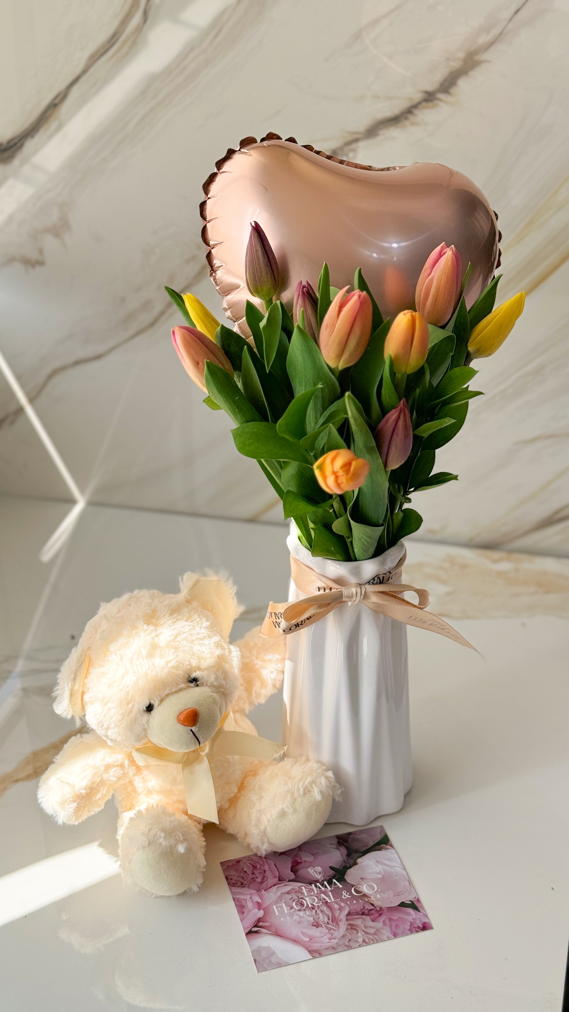 Jarrón con 10 tulipanes frescos y un adorable osito de peluche. Un regalo delicado y lleno de ternura.