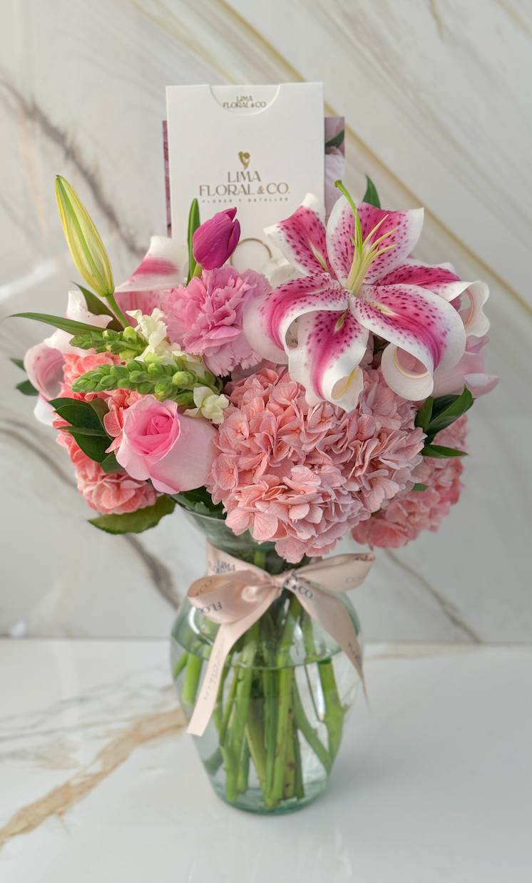 Un espectacular arreglo de flores premium con tulipanes, lirios, claveles, rosas y más. Ideal para darle un toque especial a cualquier espacio.