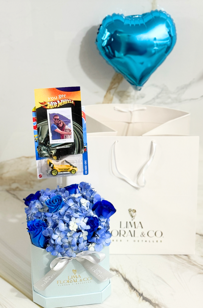 Una explosión de color y amor. Esta box incluye 5 rosas azules y hortensias azules. ¡Combínalo con un carrito Hot Wheels, un tierno osito de peluche o cómpralo solo y recibe una polaroid de regalo!