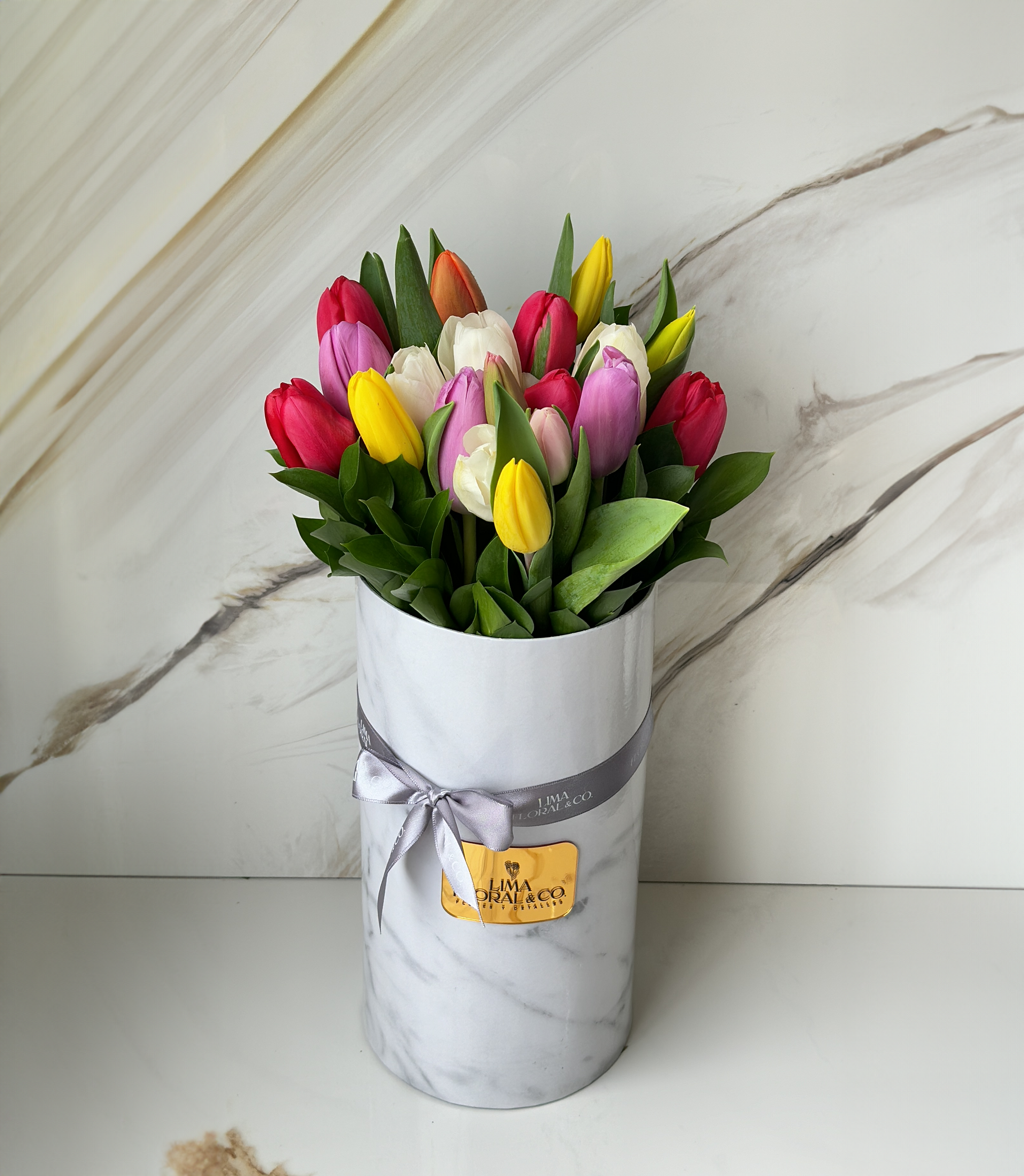 Un regalo premium para la mejor. Caja alta Lima Floral con 20 tulipanes multicolor, fino follaje, y globo. Incluye tarjeta de dedicatoria. ¡Sorprende con este detalle excepcional!
